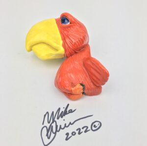 This “Baby Macaw” is a one-off piece with big personality. This measures 5″ x 5″ x 3″ and hangs on the wall with a built-in eyelet. He’s sporting a hand-painted custom glaze with paint accent that is designed for indoor use or outside in a protected/covered area.