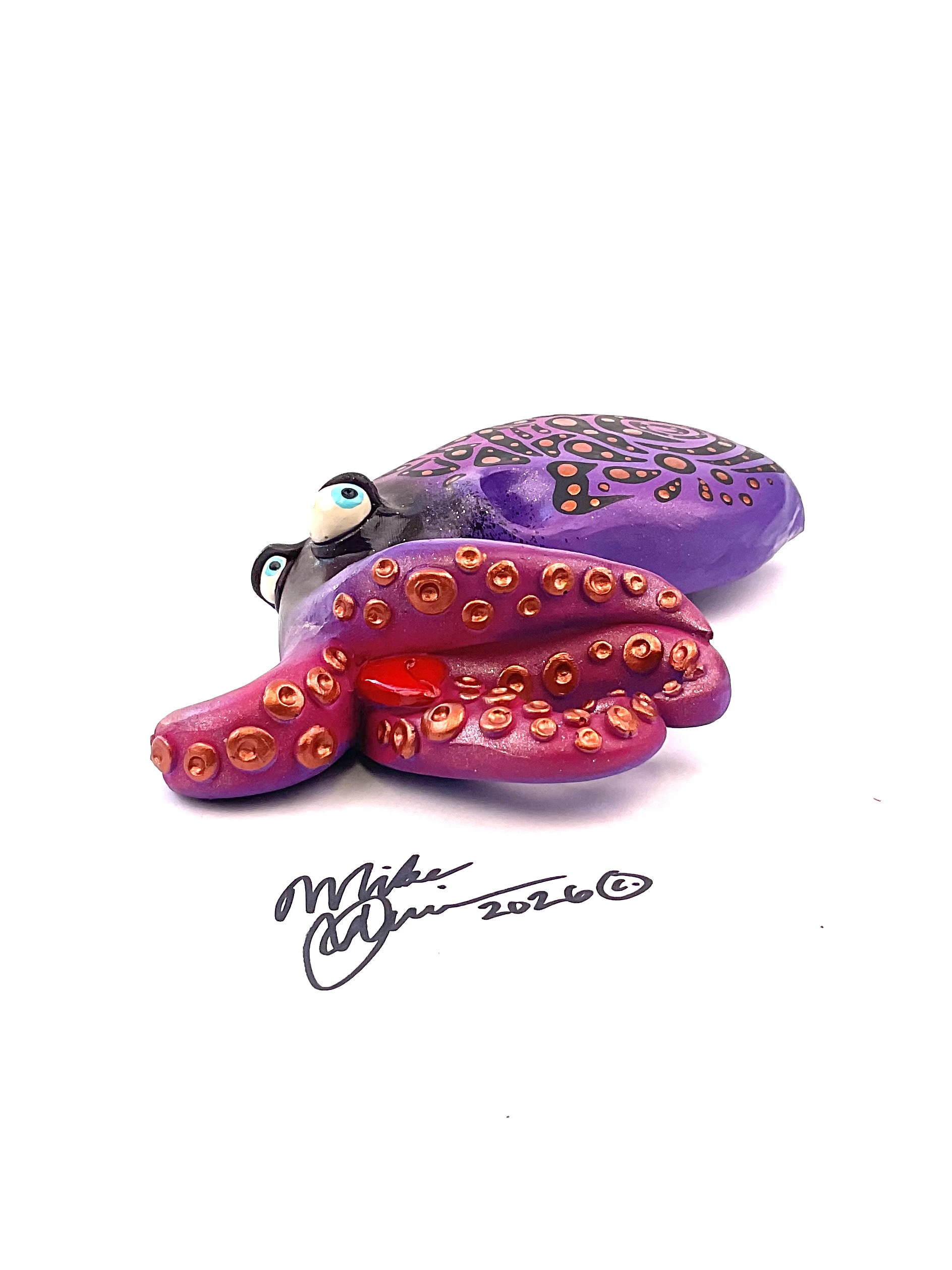 This obnoxious octopus is named “Bernie”, he features an oversized head, shifty eyes, and tenacious tentacles. He measures 6″ x 7″ and hangs on the wall with a built-in hook. He’s sporting a hand-painted custom finish that is designed for indoor use or outside in a protected/covered area.