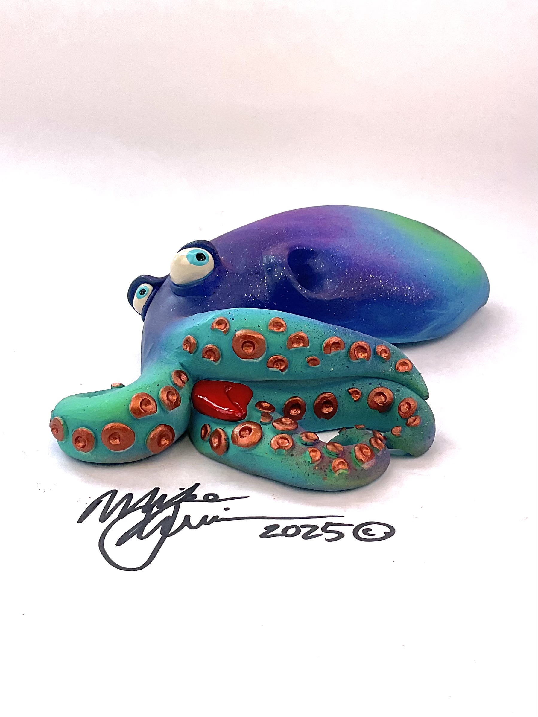 This obnoxious octopus is named “Bernie”, he features an oversized head, shifty eyes, and tenacious tentacles. He measures 6″ x 7″ and hangs on the wall with a built-in hook. He’s sporting a hand-painted custom finish that is designed for indoor use or outside in a protected/covered area.