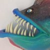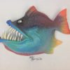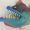 You are looking at a handmade one-off fish with a painted finish and a toothy personality. He measures 16.5″ x 11″ x 4″ and hangs on the wall with a built-in hanger. This fish is finely detailed with carvings, notched fins, and glorious teeth.  He’s sporting a custom finish that is designed for indoor use or outside in a protected/covered area.