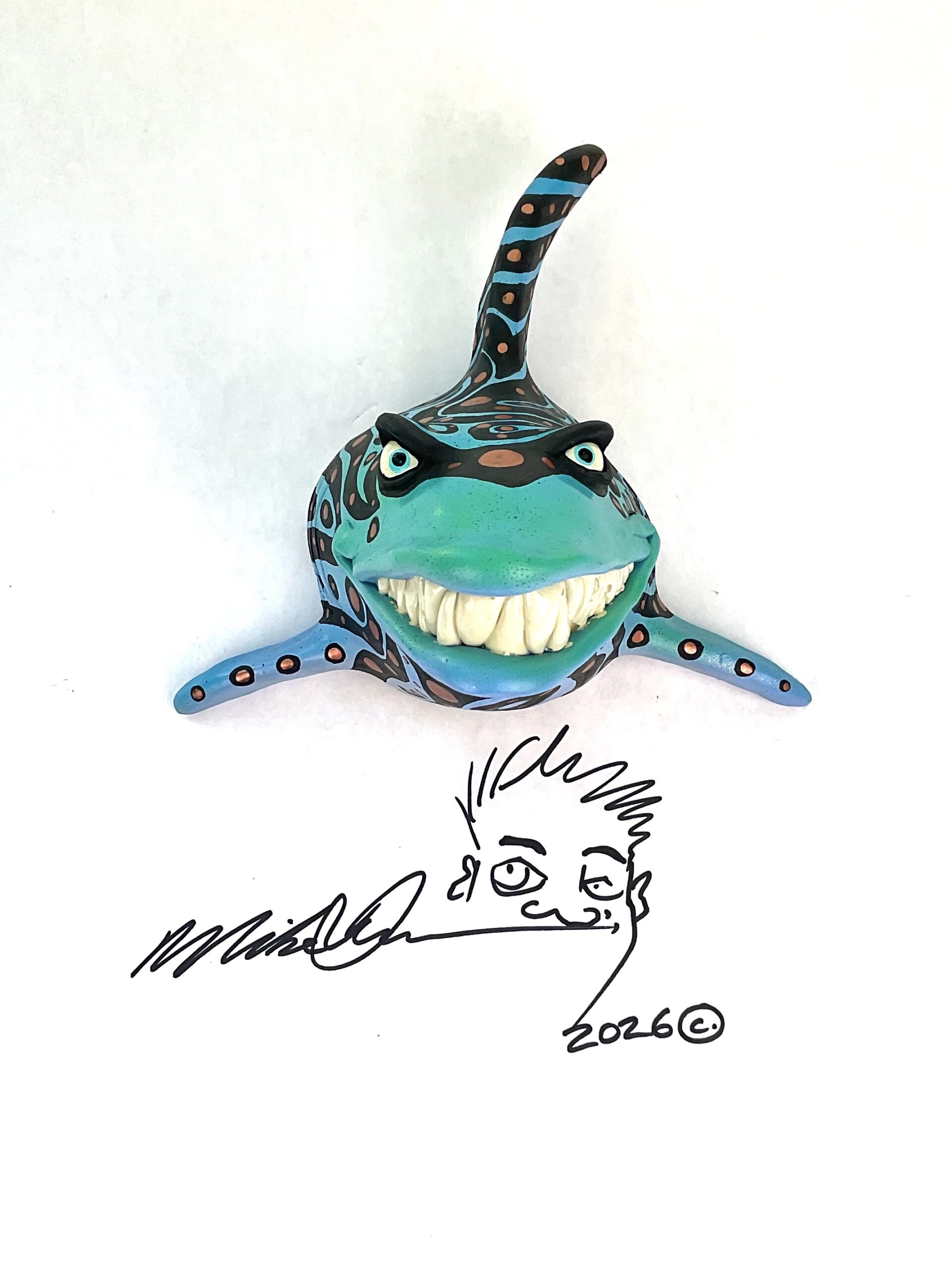 This piece is designed and created by artist Mike Quinn, it’s part of his Fish with Attitude collection. It’s one of a kind nature means it will have unique markings, design, spots, teeth, fur, claws or whatever is applicable to the creature posted.