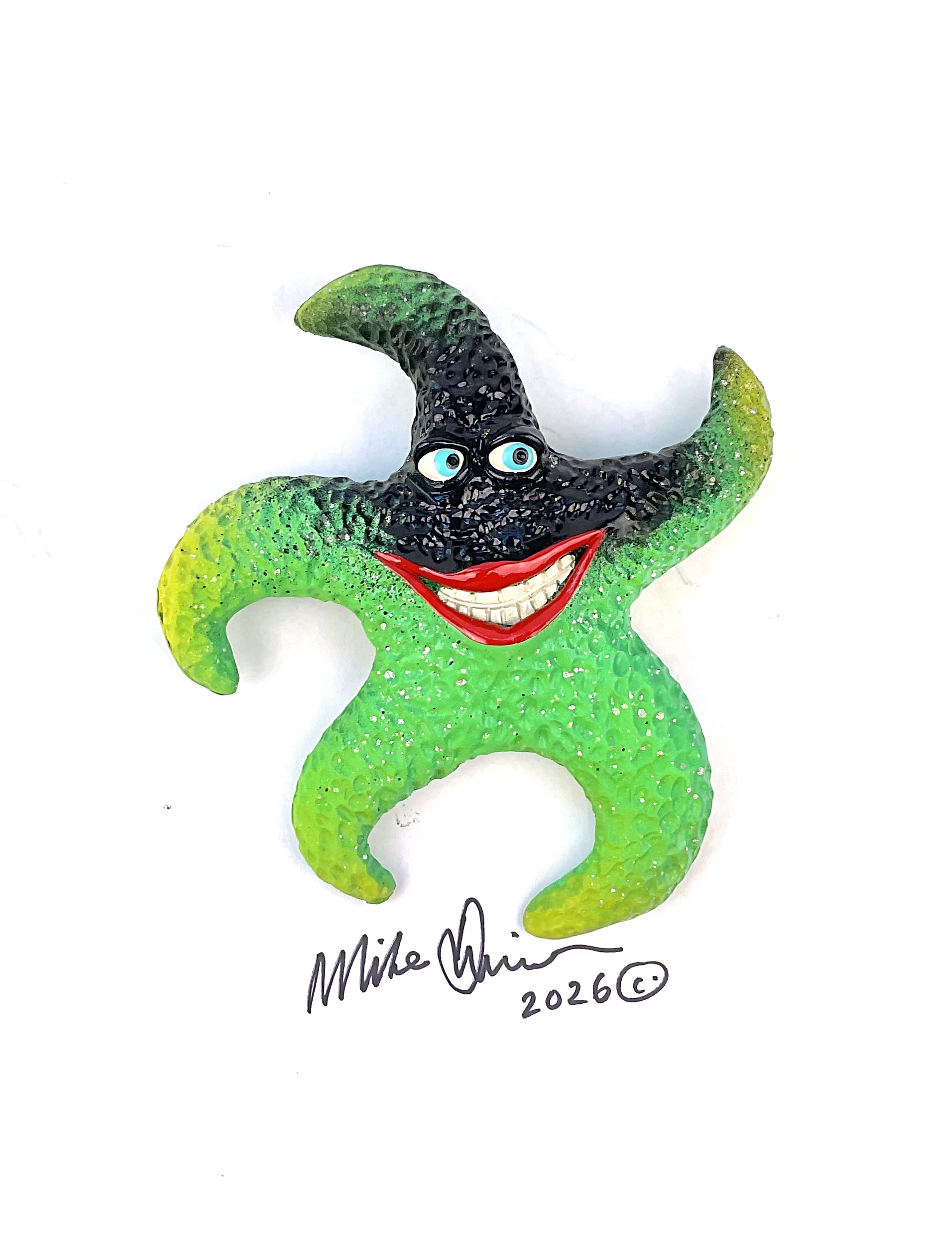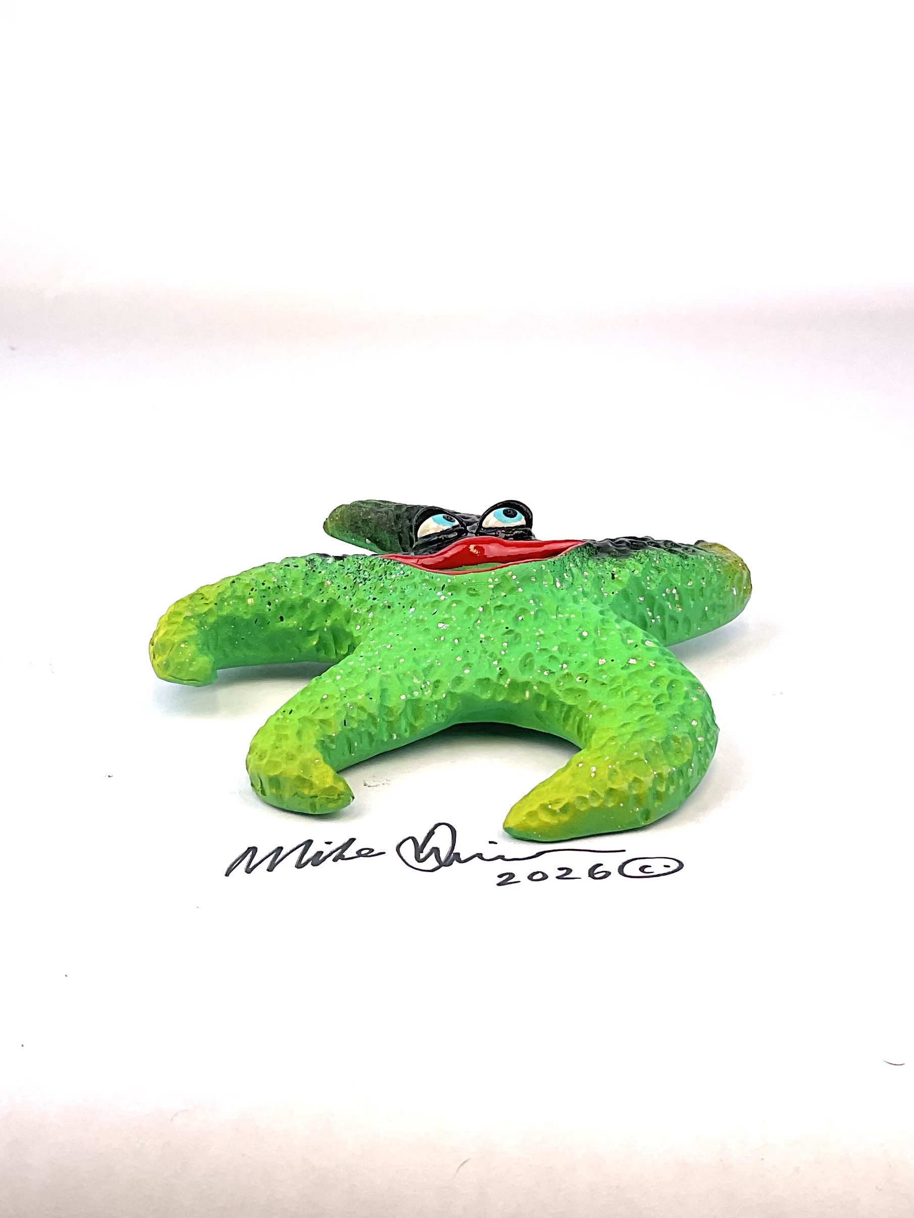 This snazzy starfish is named “Libery”, She likes to liberate oysters from their shells…against their will. She measures 6.5″ x 7″ and hangs on the wall with a built in eyelet. She’s sporting a hand painted custom finish that is designed for indoor use or outside in a protected/covered area.