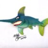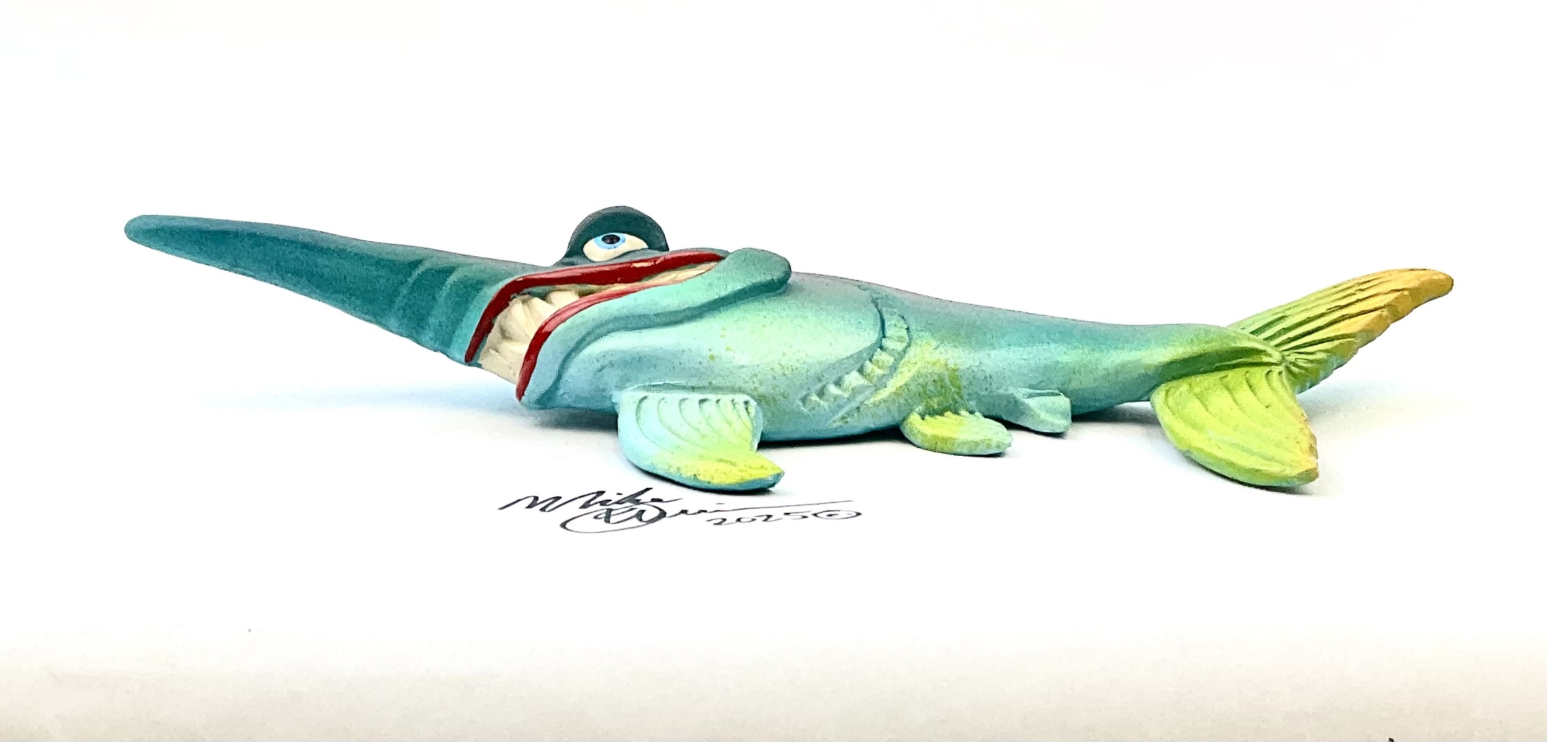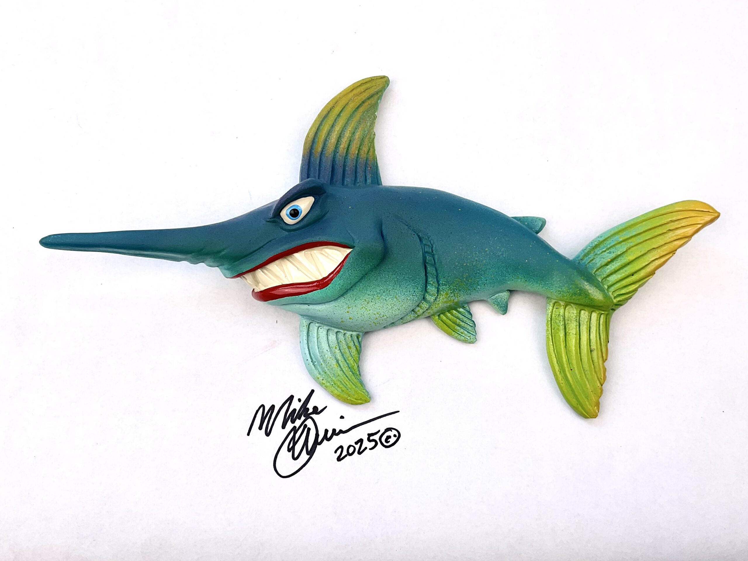 You’ll find him trolling the continental shelf.  He likes it where the water is deep and salty!  He measures 11″ x 6″ and hangs on the wall with a built-in hook. He’s sporting a hand-painted custom finish that is designed for indoor use or outside in a protected/covered area.