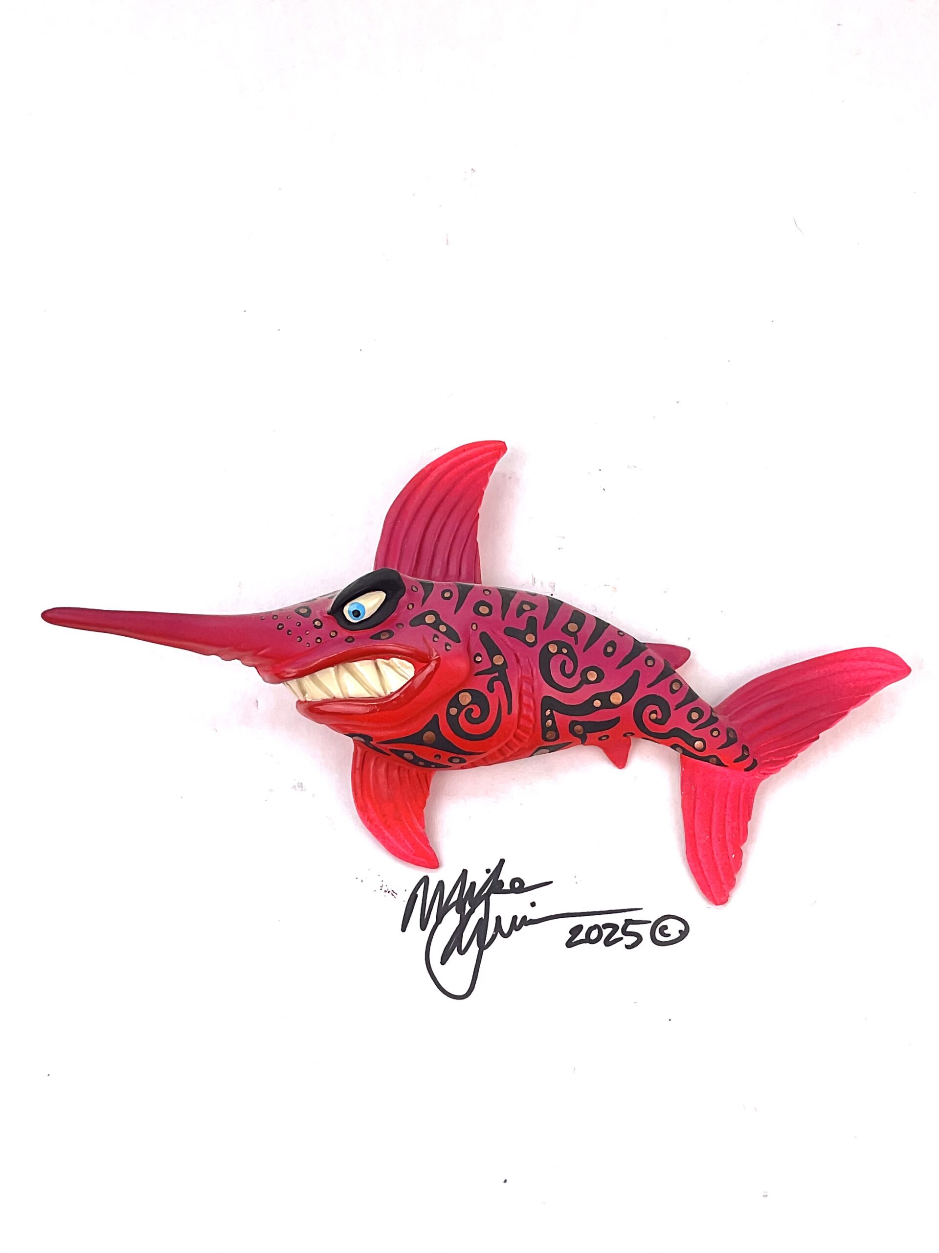 This piece is designed and created by artist Mike Quinn, it’s part of his Fish with Attitude collection. It’s one of a kind nature means it will have unique markings, design, spots, teeth, fur, claws or whatever is applicable to the creature posted.
