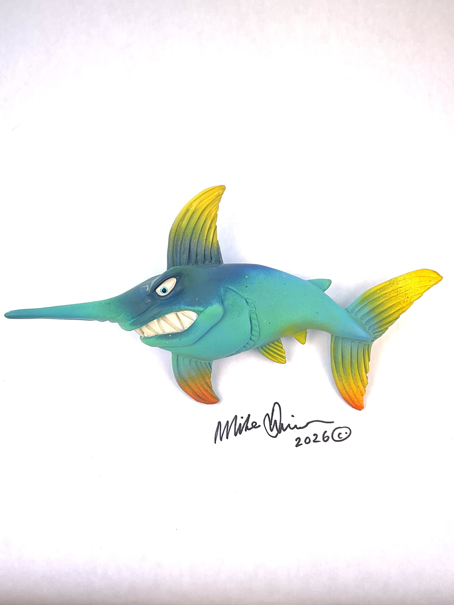 You’ll find him trolling the continental shelf.  He likes it where the water is deep and salty!  He measures 11″ x 6″ and hangs on the wall with a built-in hook. He’s sporting a hand-painted custom finish that is designed for indoor use or outside in a protected/covered area.