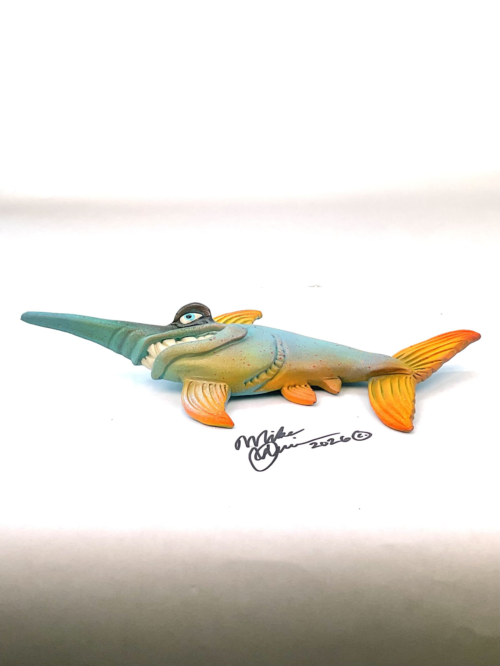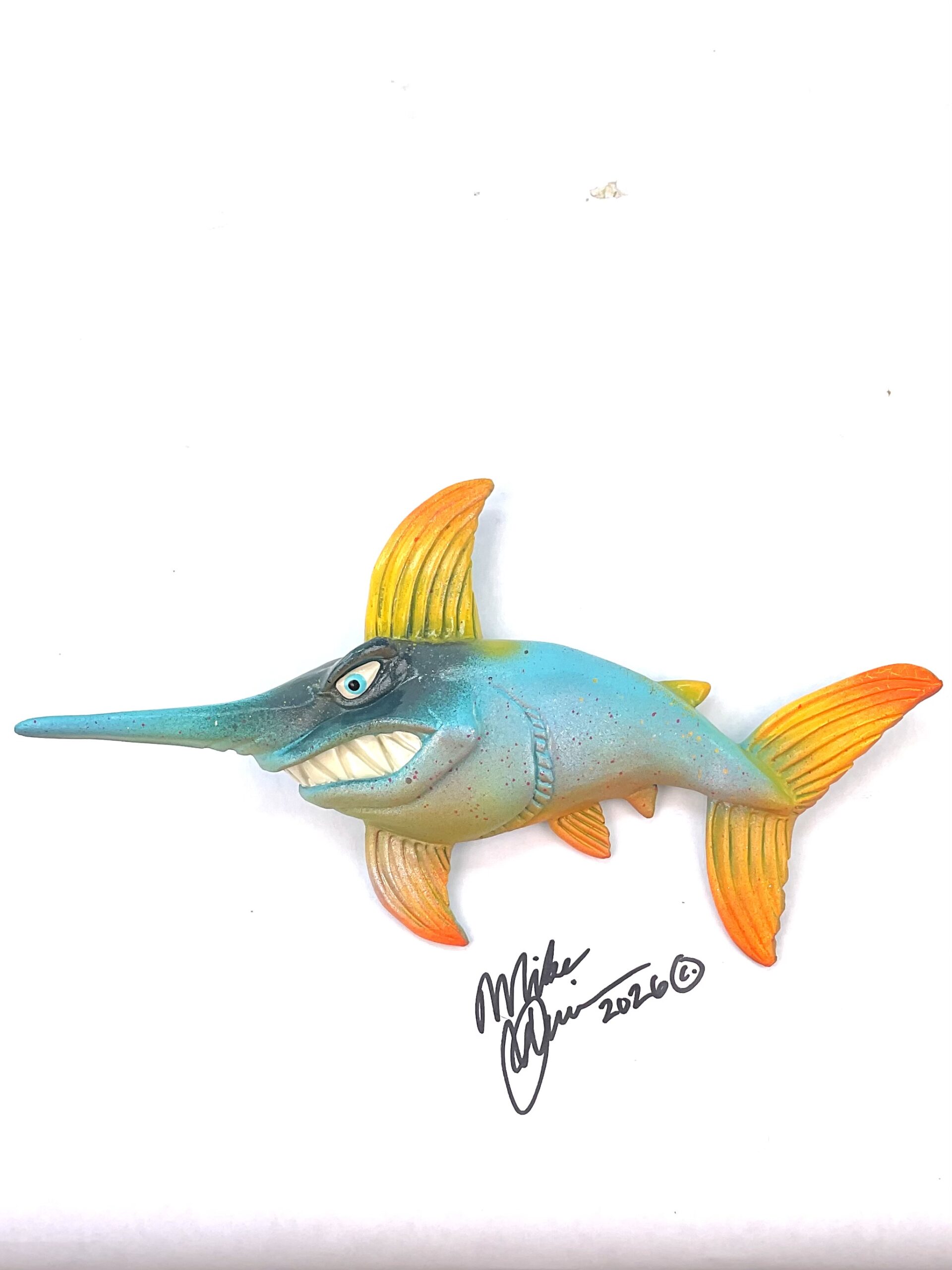 This piece is designed and created by artist Mike Quinn, it’s part of his Fish with Attitude collection. It’s one of a kind nature means it will have unique markings, design, spots, teeth, fur, claws or whatever is applicable to the creature posted.