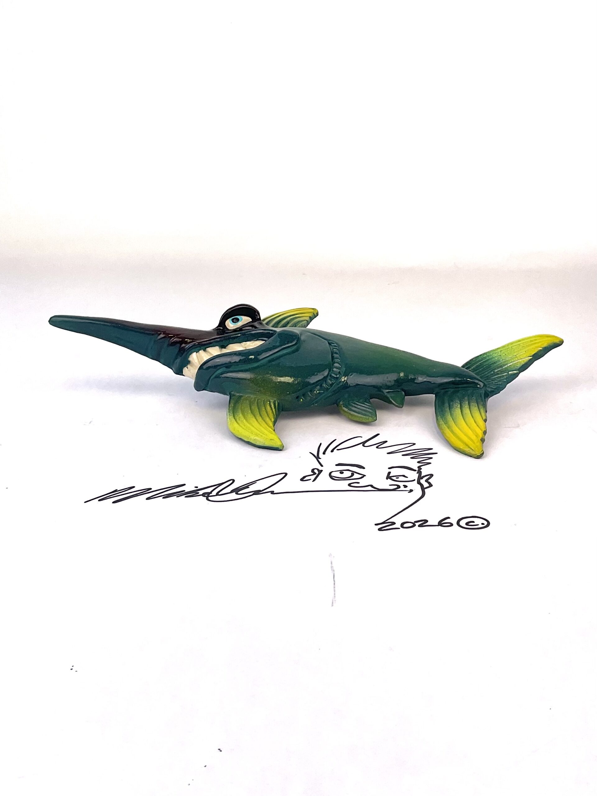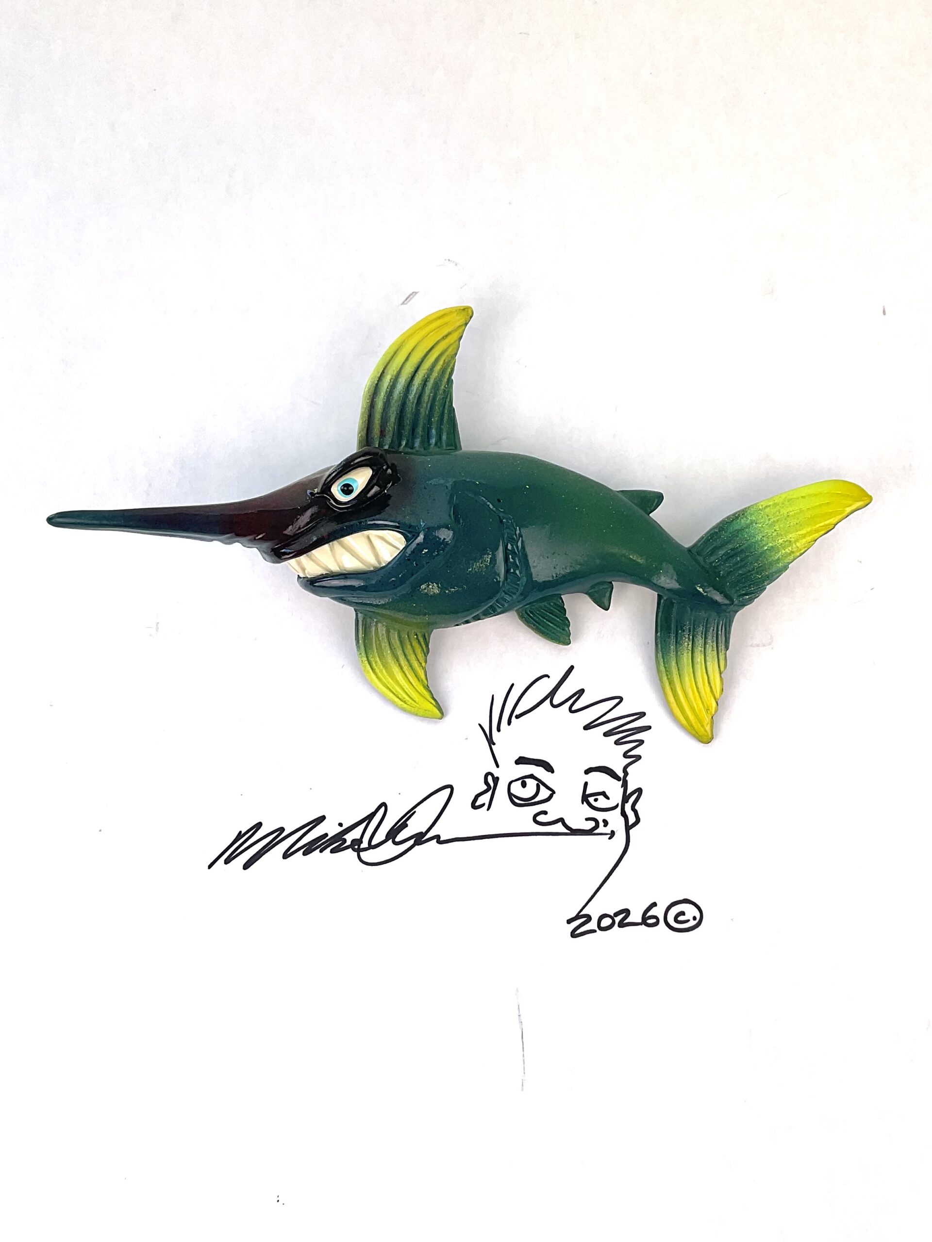 This piece is designed and created by artist Mike Quinn, it’s part of his Fish with Attitude collection. It’s one of a kind nature means it will have unique markings, design, spots, teeth, fur, claws or whatever is applicable to the creature posted.