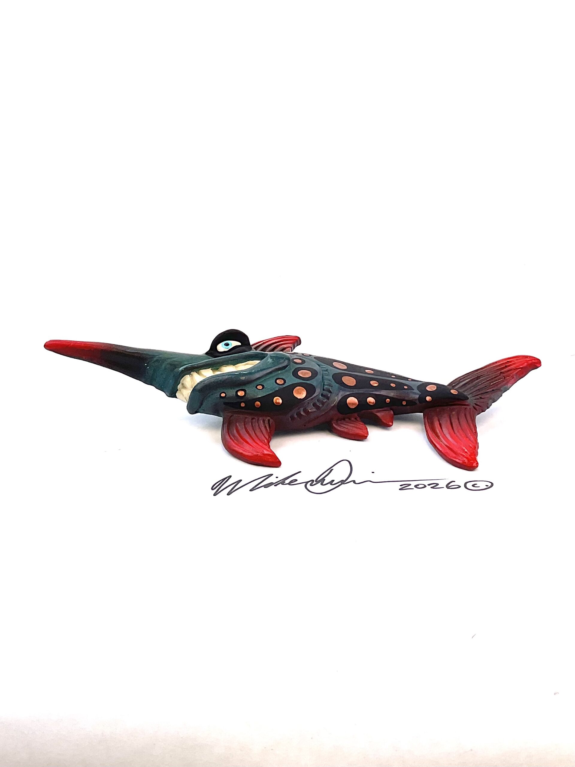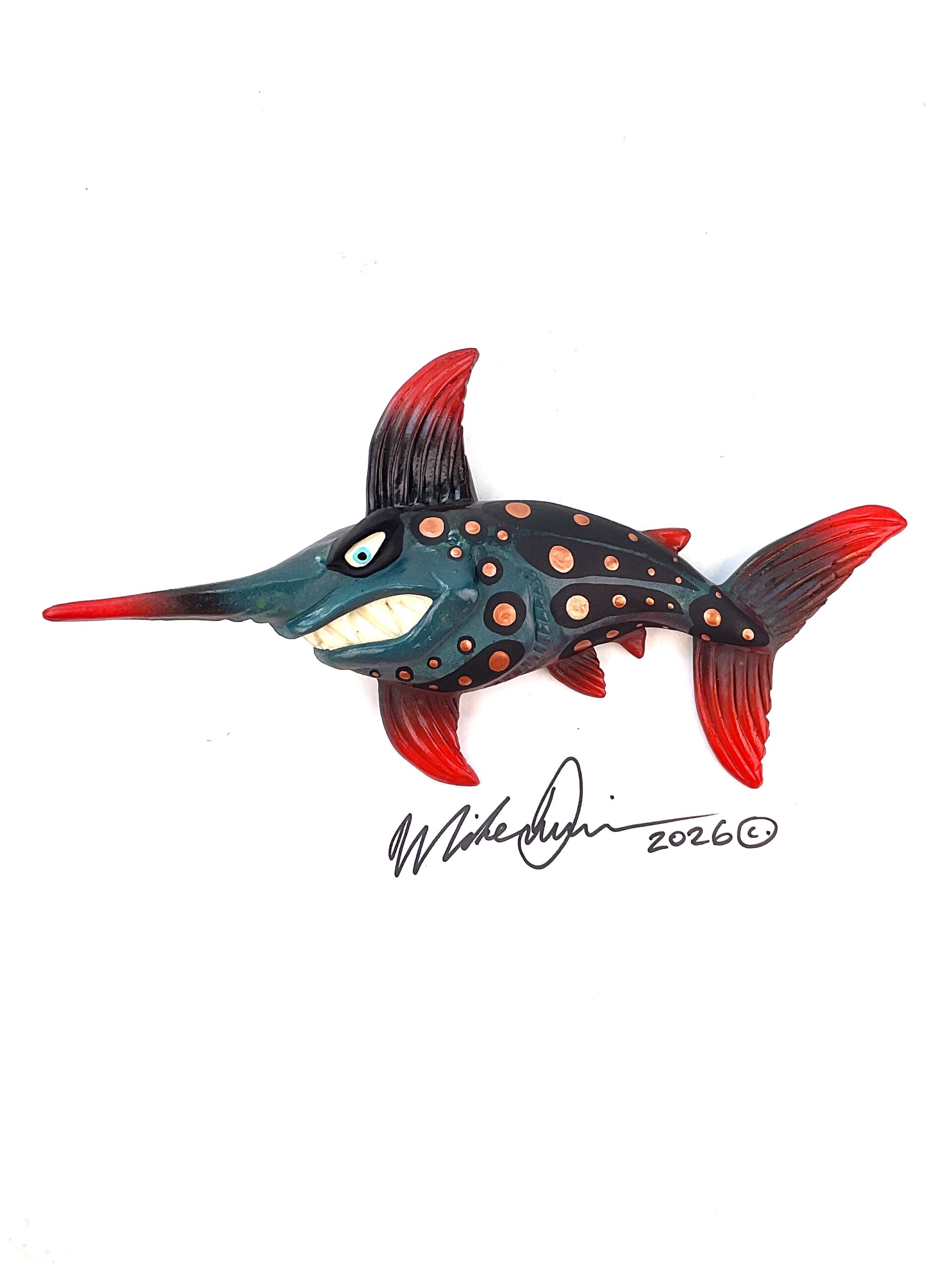 This piece is designed and created by artist Mike Quinn, it’s part of his Fish with Attitude collection. It’s one of a kind nature means it will have unique markings, design, spots, teeth, fur, claws or whatever is applicable to the creature posted.