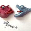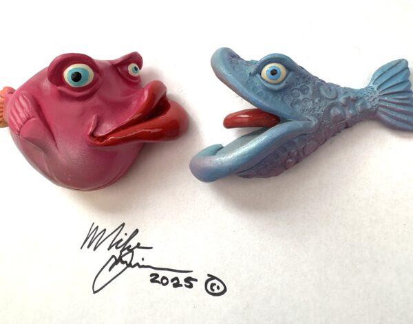 This super serious fish is named “Dr. Billy Bunko”, He’s quite the scholar with degrees from the prestigious algae league school Harvard. He measures 6″ x 3″. “Bumpy Bob” is a true comedian he’s quick with a joke and keeps us all laughing! He measures 4″ x 2.5″ and hangs on the wall with a built-in hanger. They are both sporting a hand-painted custom finish that is designed for indoor use or outside in a protected/covered area.