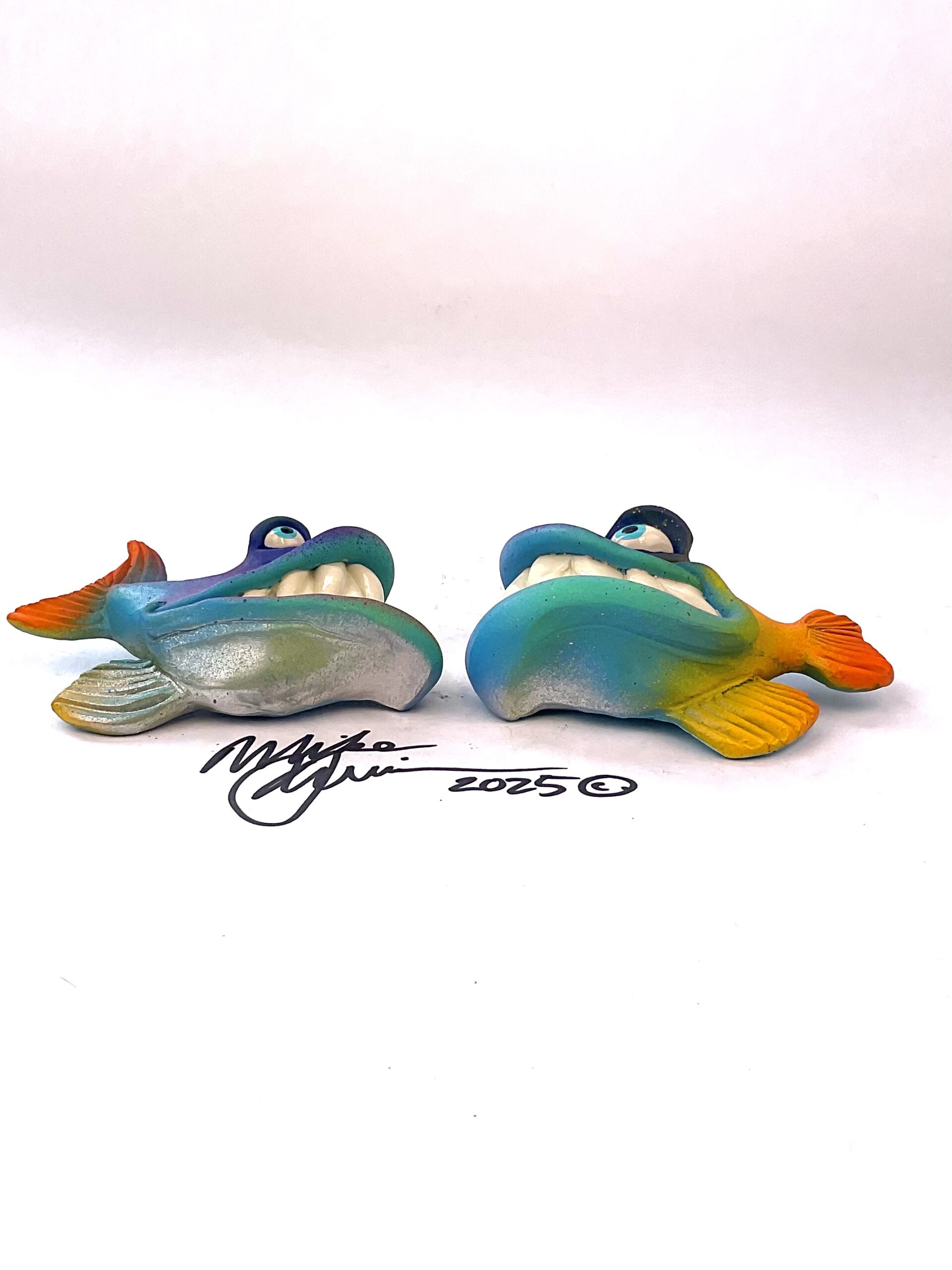 Sherri is just a delight! Most days are spent catering to her favorite charities that work to spay and neuter feral catfish colonies. In her downtime, she enjoys spending time with her lifelong fin-mate Cliff. She measures a modest 4″ x 3″. This fab fish might be small, but he has a big bite! Cliff is the curator of the Oceanside Art institute, it has one of the largest exotic fish displays in the world! He measures 4″ x 2.5″ and hangs on the wall with a built-in hook. They are both sporting a hand-painted custom finish that is designed for indoor use or outside in a protected/covered area.