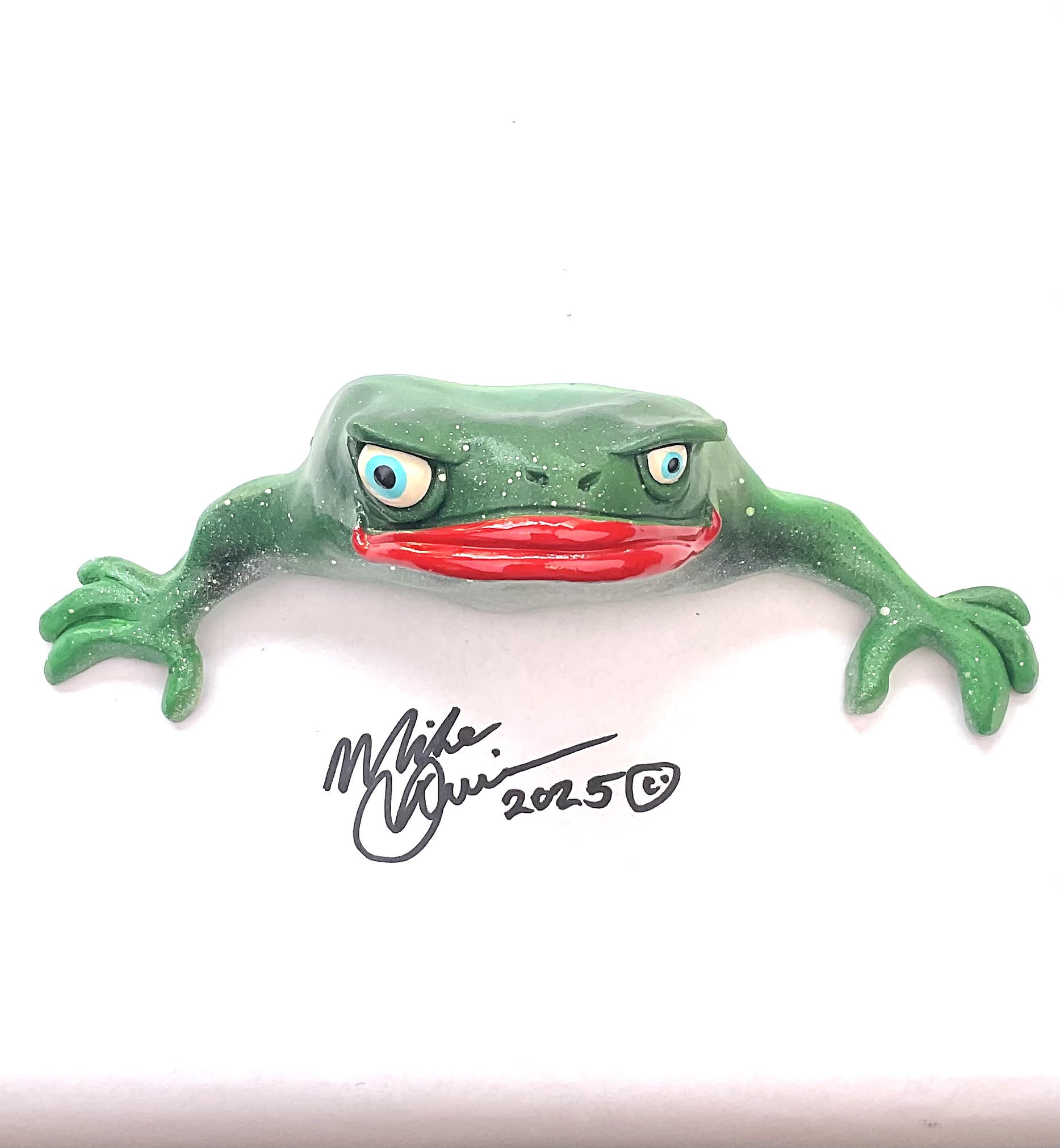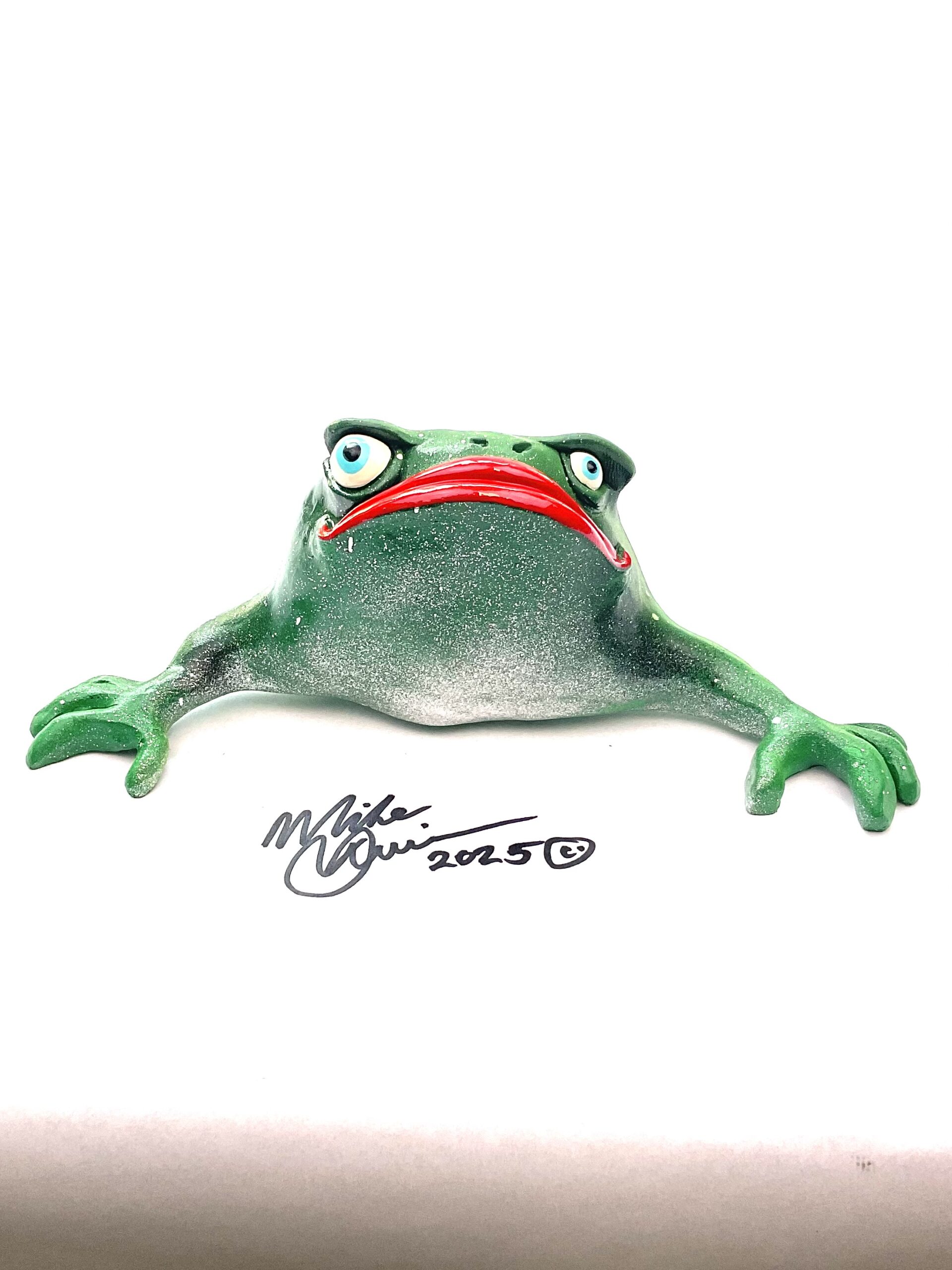 This snazzy frog is named “Don Juan”, he features an oversized mouth, snarky expression and attitude galore. He measures 8.5″ x 3.5″ and hangs on the wall with a built in eyelet. He’s sporting a hand painted custom finish that is designed for indoor use or outside in a protected/covered area.