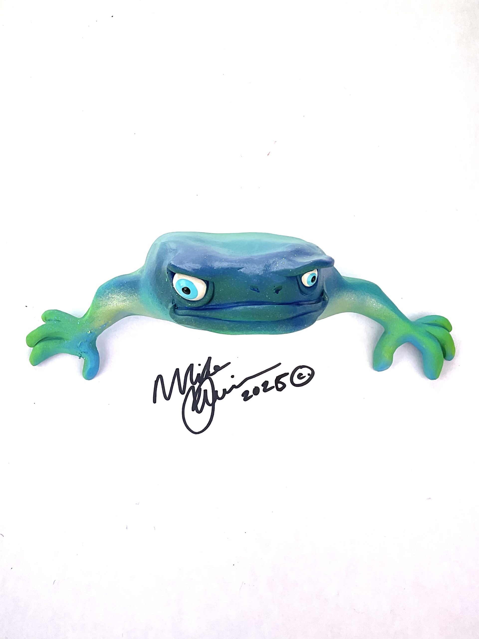 This snazzy frog is named “Don Juan”, he features an oversized mouth, snarky expression and attitude galore. He measures 8.5″ x 3.5″ and hangs on the wall with a built in eyelet. He’s sporting a hand painted custom finish that is designed for indoor use or outside in a protected/covered area.
