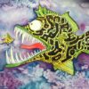 This print is titled Electric Ed and features a fish with a positively electric personality. This piece is super bright with a couple of Mike’s wild patterned fish. It makes you wonder…are those fish related? Is he about to eat his cousin? They must have the most awkward holidays.