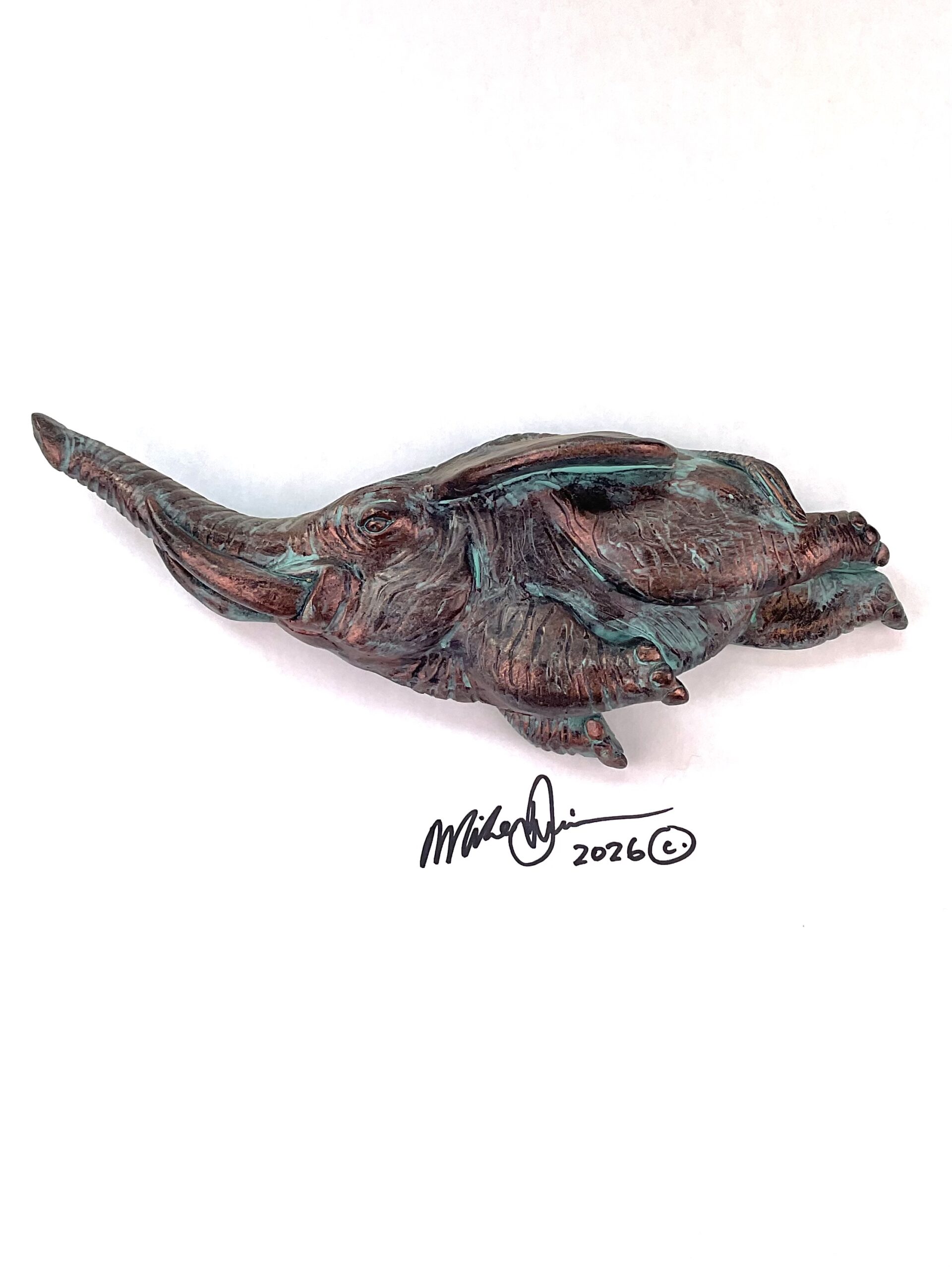 “Elwood” retired from the circus he started a garage band. They call themselves the “Pachyderms”. He measures 12.5″x 5″x 3″ and hangs on the wall with a built-in hook. He’s sporting a hand painted custom finish that is designed for indoor use or outside in a protected/covered area.