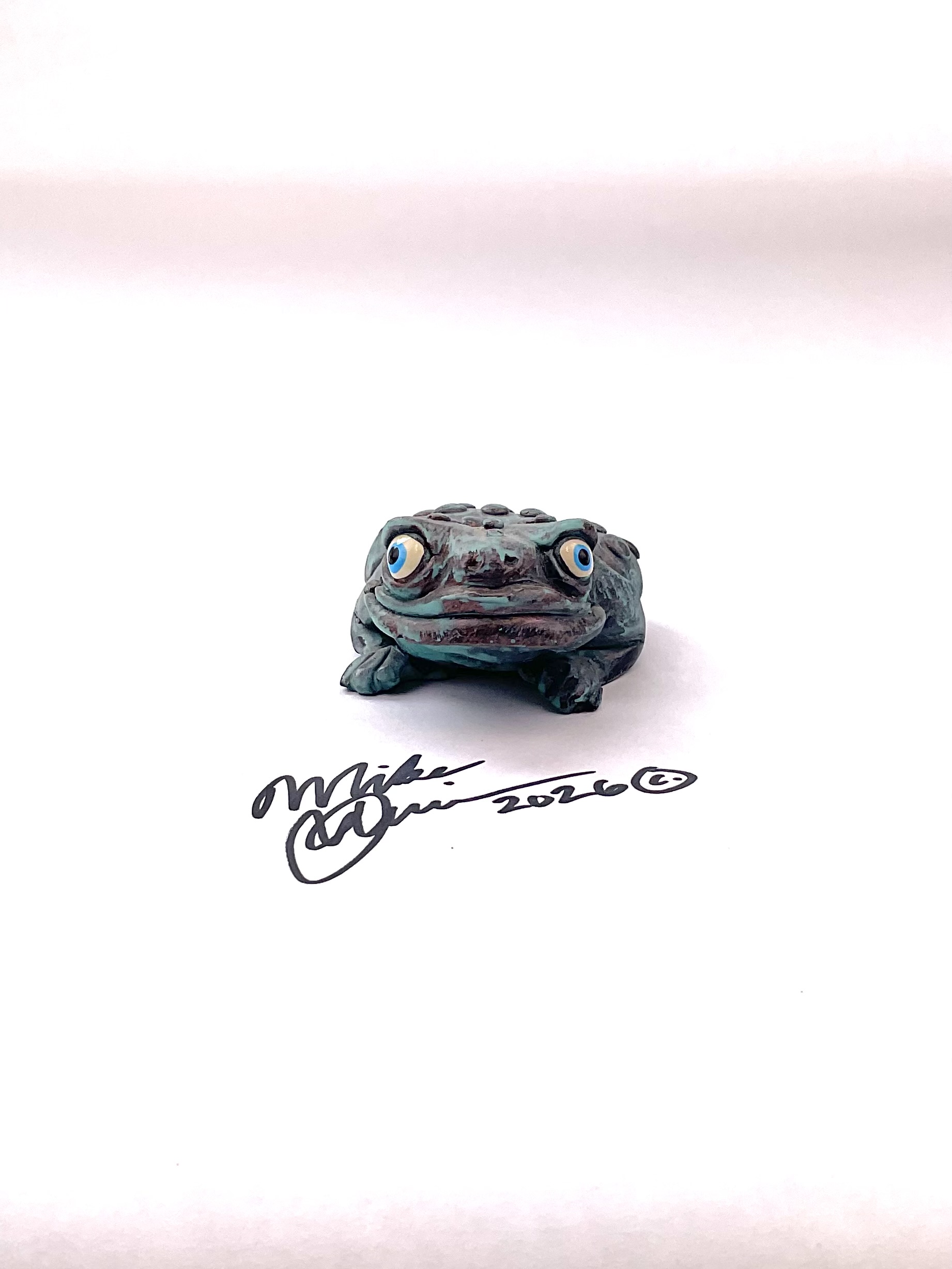 This snazzy frog is named “Felipe”. He always wanted to be a waiter, but the plates were far too heavy. He measures 3″ x 2″ and sits on the table. He’s sporting a hand painted custom finish that is designed for indoor use or outside in a protected/covered area.