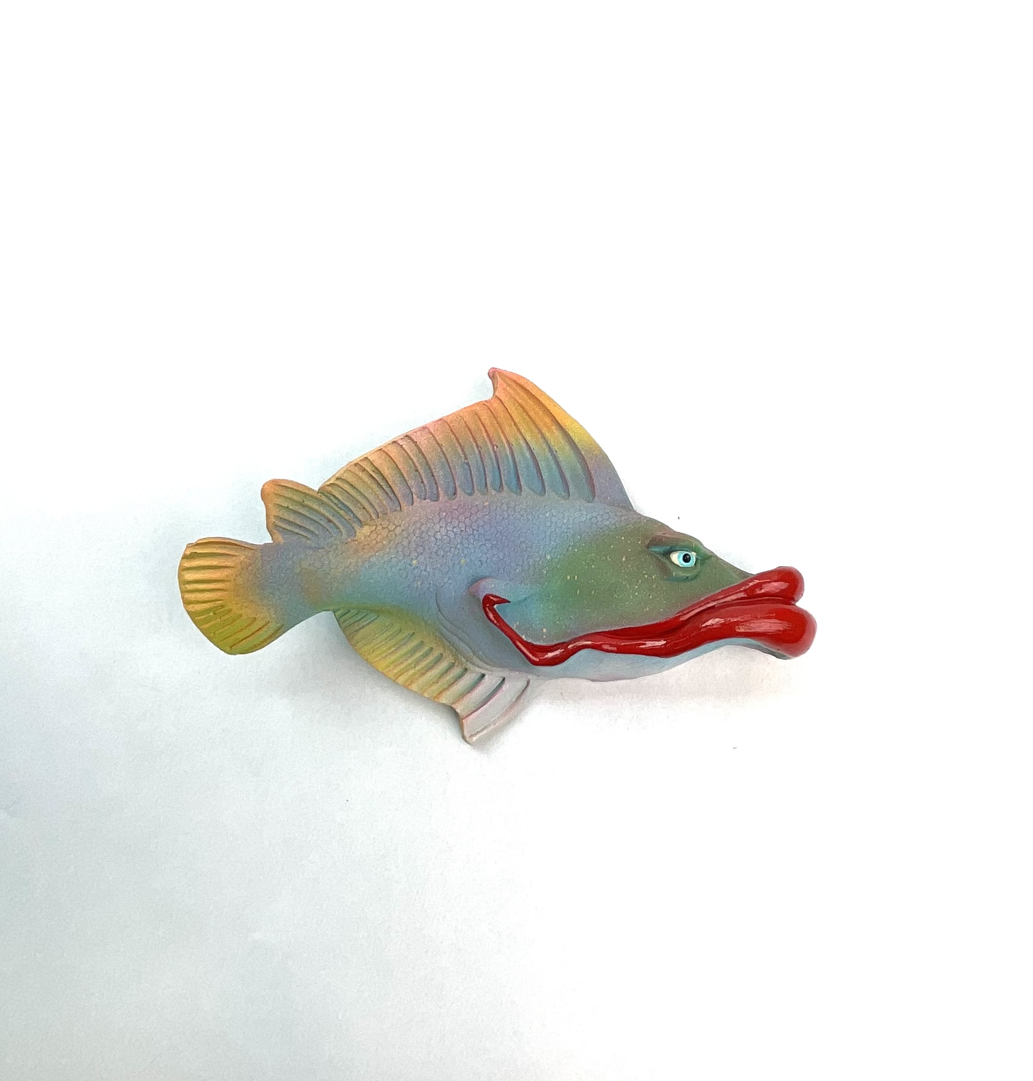 This fab fish sports a gigantic set of lips and is named Flo-dad. As everyone knows flo-dad has the best dad jokes in town and he loves hanging with his friends at the crab shack. He measures 9.5″ x 5″ and hangs on the wall with a built-in hook. He’s sporting a hand-painted custom finish that is designed for indoor use or outside in a protected/covered area.