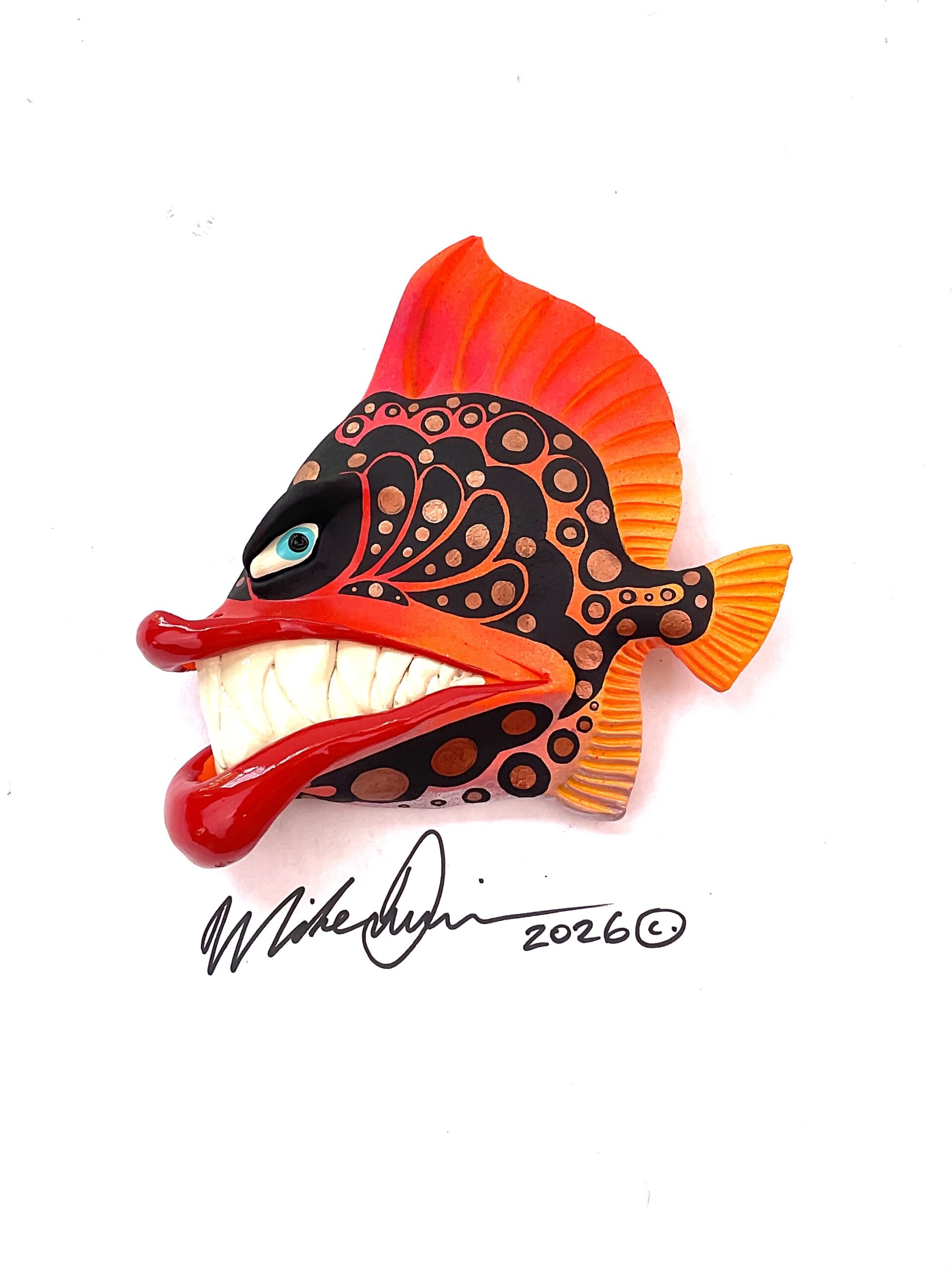 This piece is designed and created by artist Mike Quinn, it’s part of his Fish with Attitude collection. It’s one of a kind nature means it will have unique markings, design, spots, teeth, fur, claws or whatever is applicable to the creature posted.