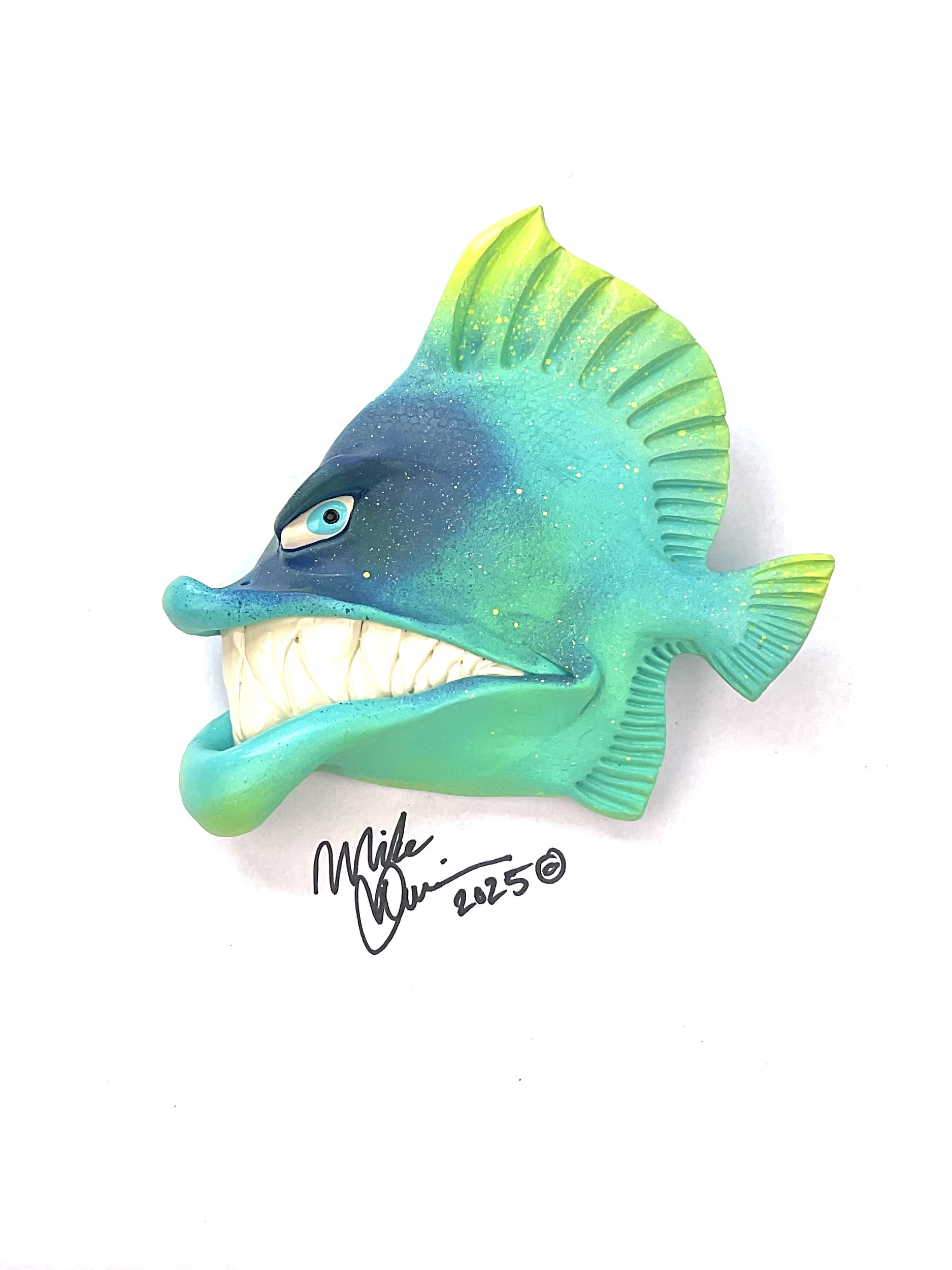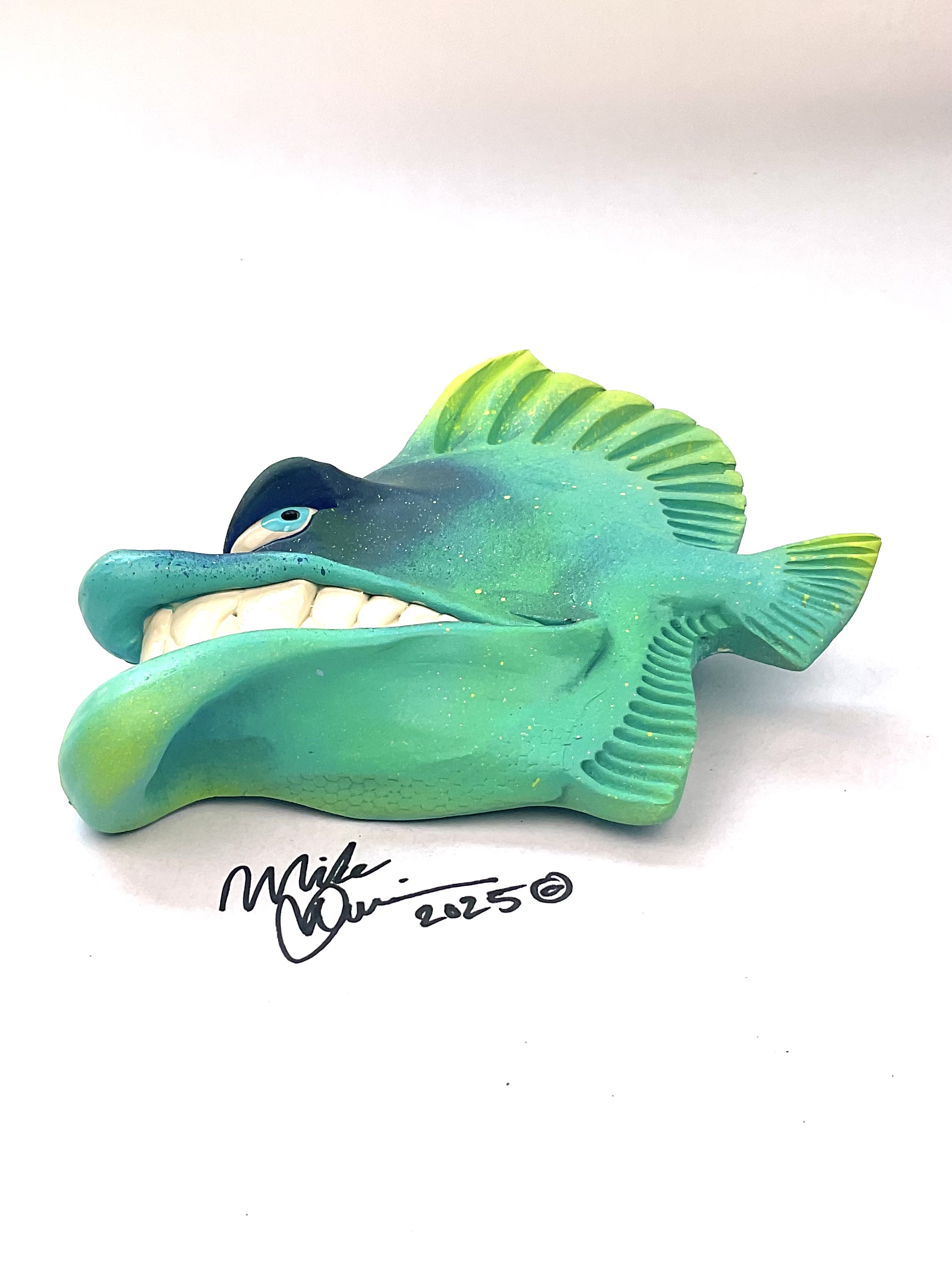 This piece is designed and created by artist Mike Quinn, it’s part of his Fish with Attitude collection. It’s one of a kind nature means it will have unique markings, design, spots, teeth, fur, claws or whatever is applicable to the creature posted.