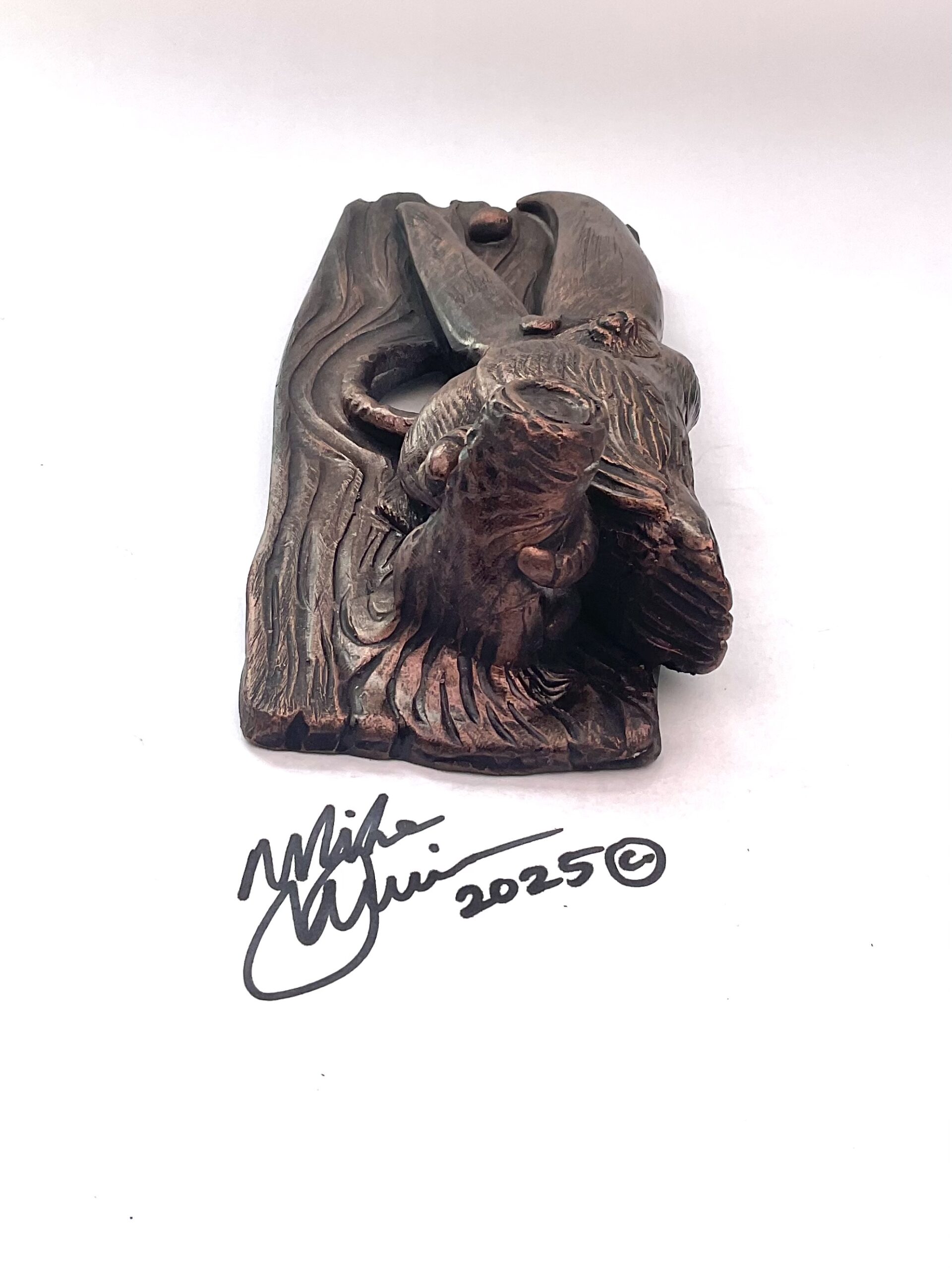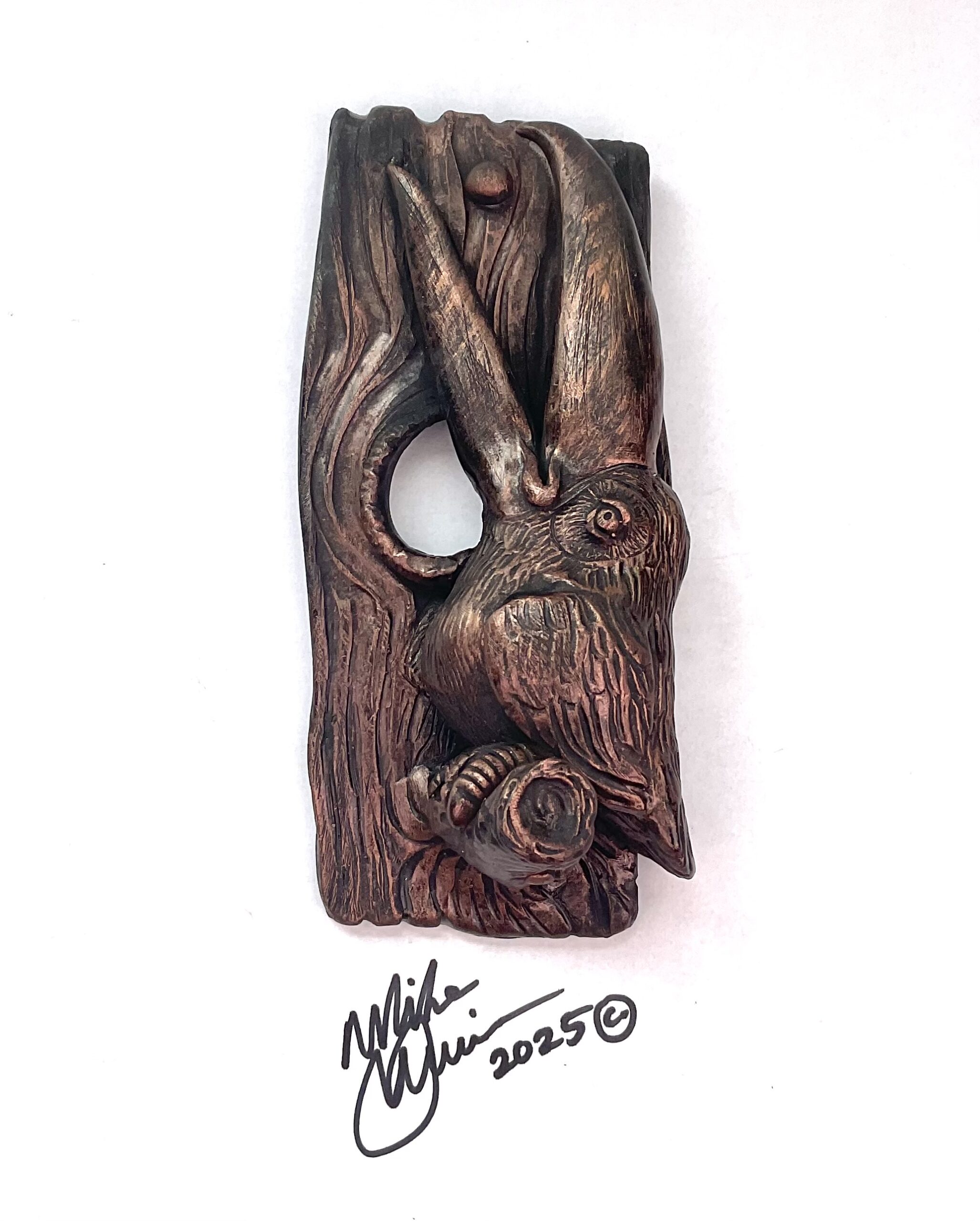 “Frank Dela Omaha” measures 9″x 4.5″x 3.5″ and hangs on the wall with a built-in hook. He’s sporting a hand-painted custom finish that is designed for indoor use or outside in a protected/covered area.