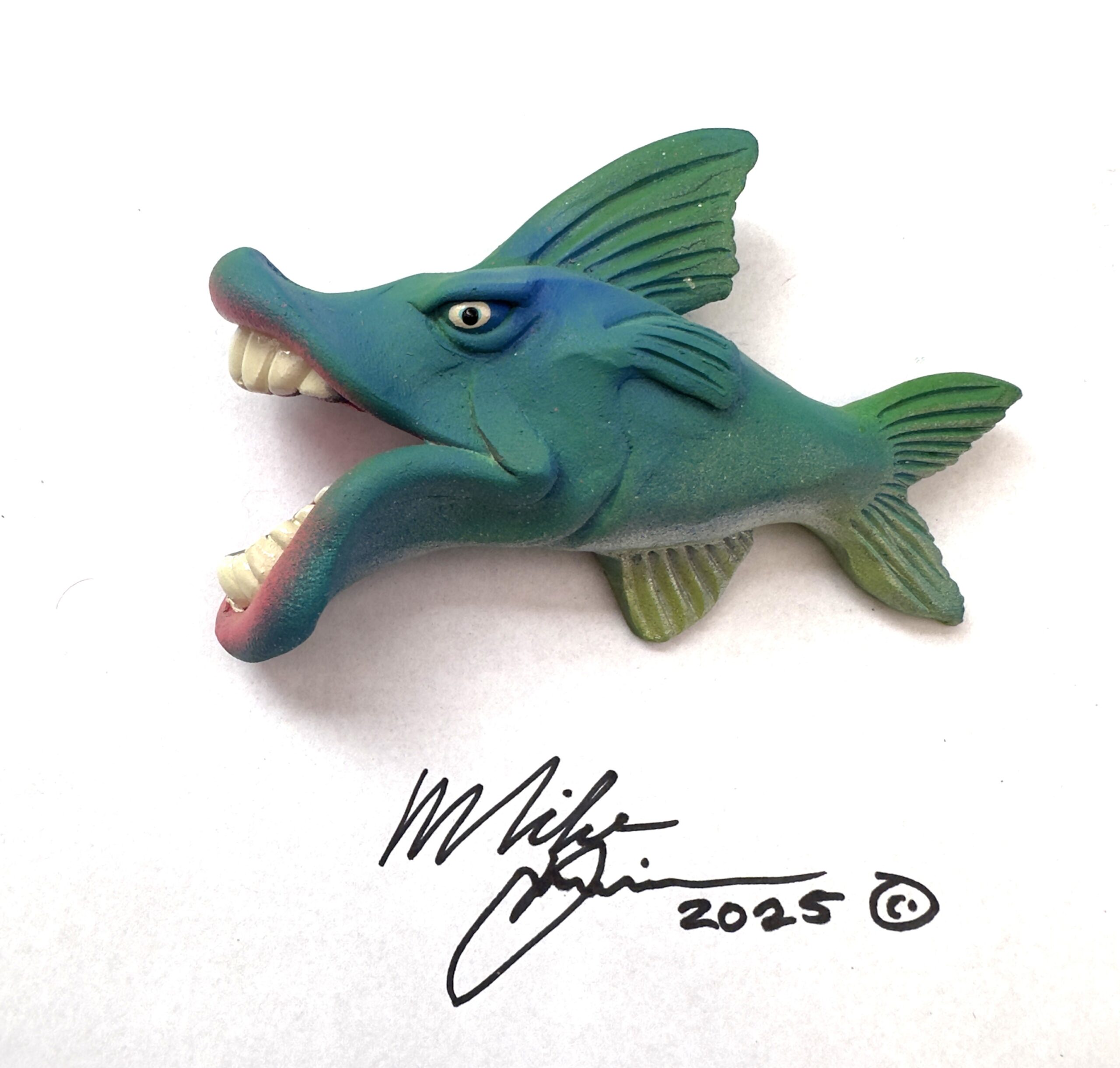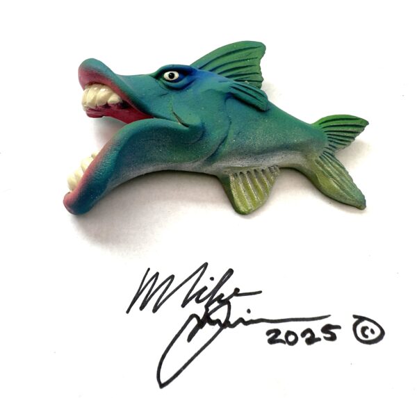 This piece is designed and created by artist Mike Quinn, it’s part of his Fish with Attitude collection. It’s one of a kind nature means it will have unique markings, design, spots, teeth, fur, claws or whatever is applicable to the creature posted.