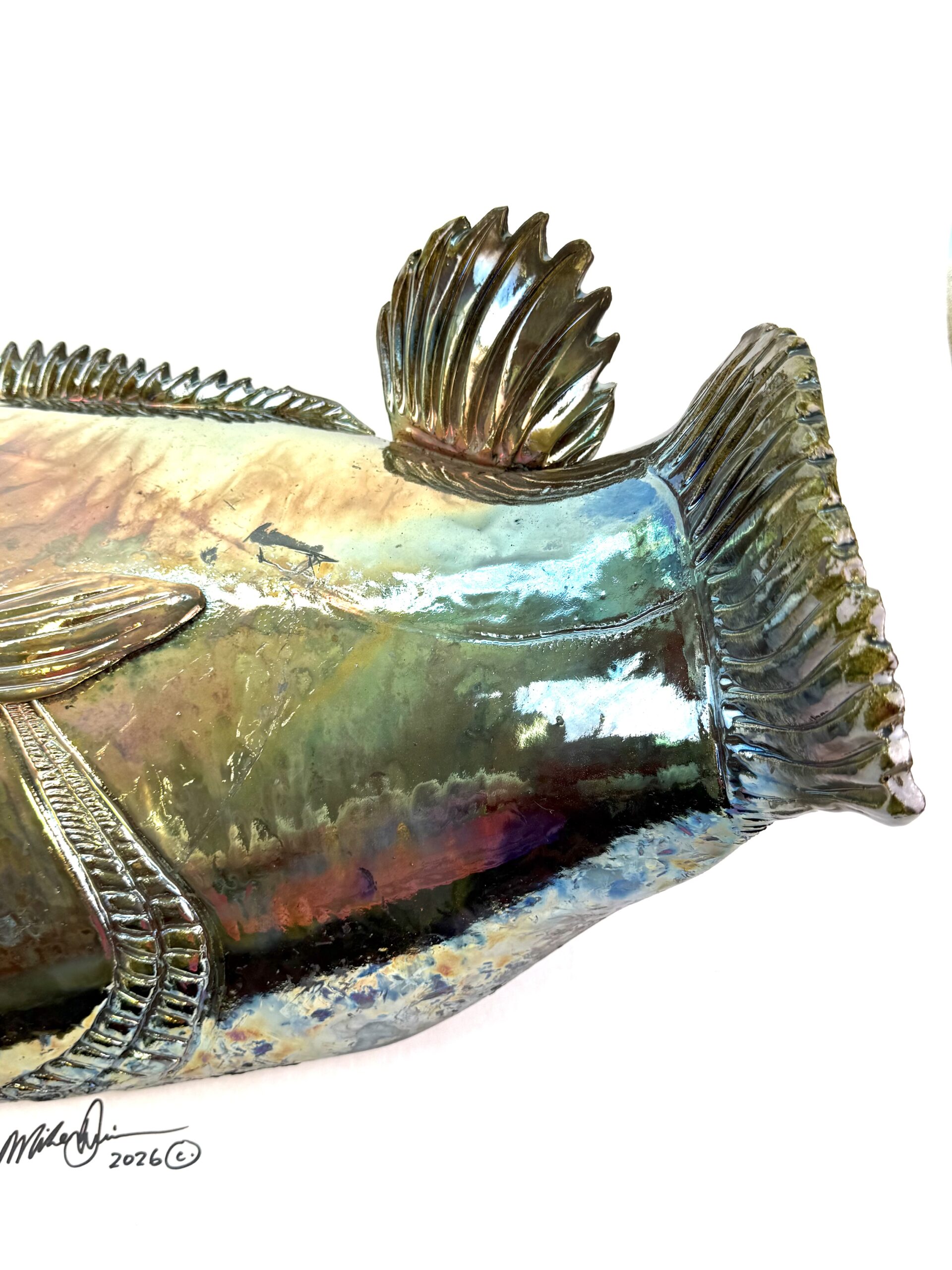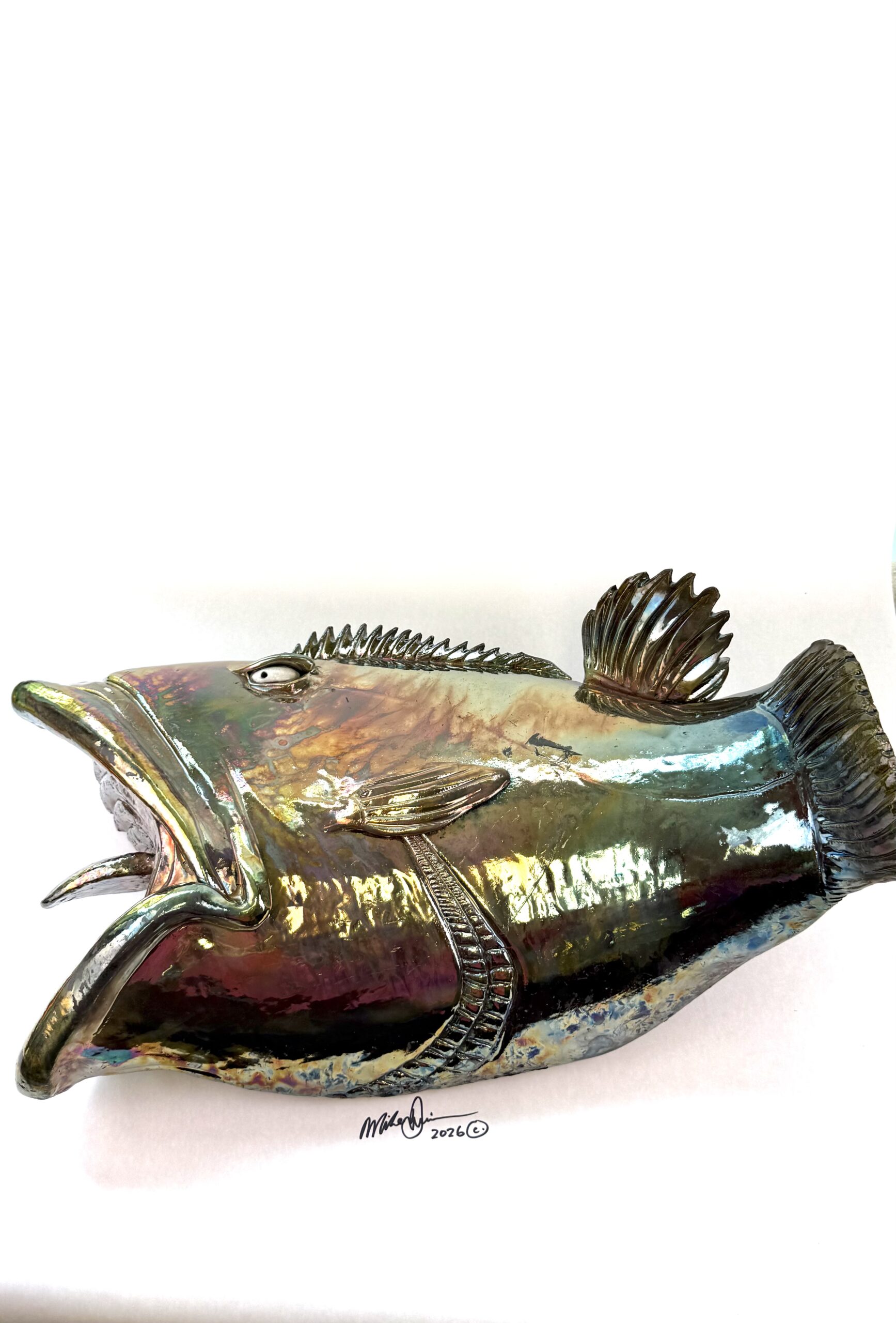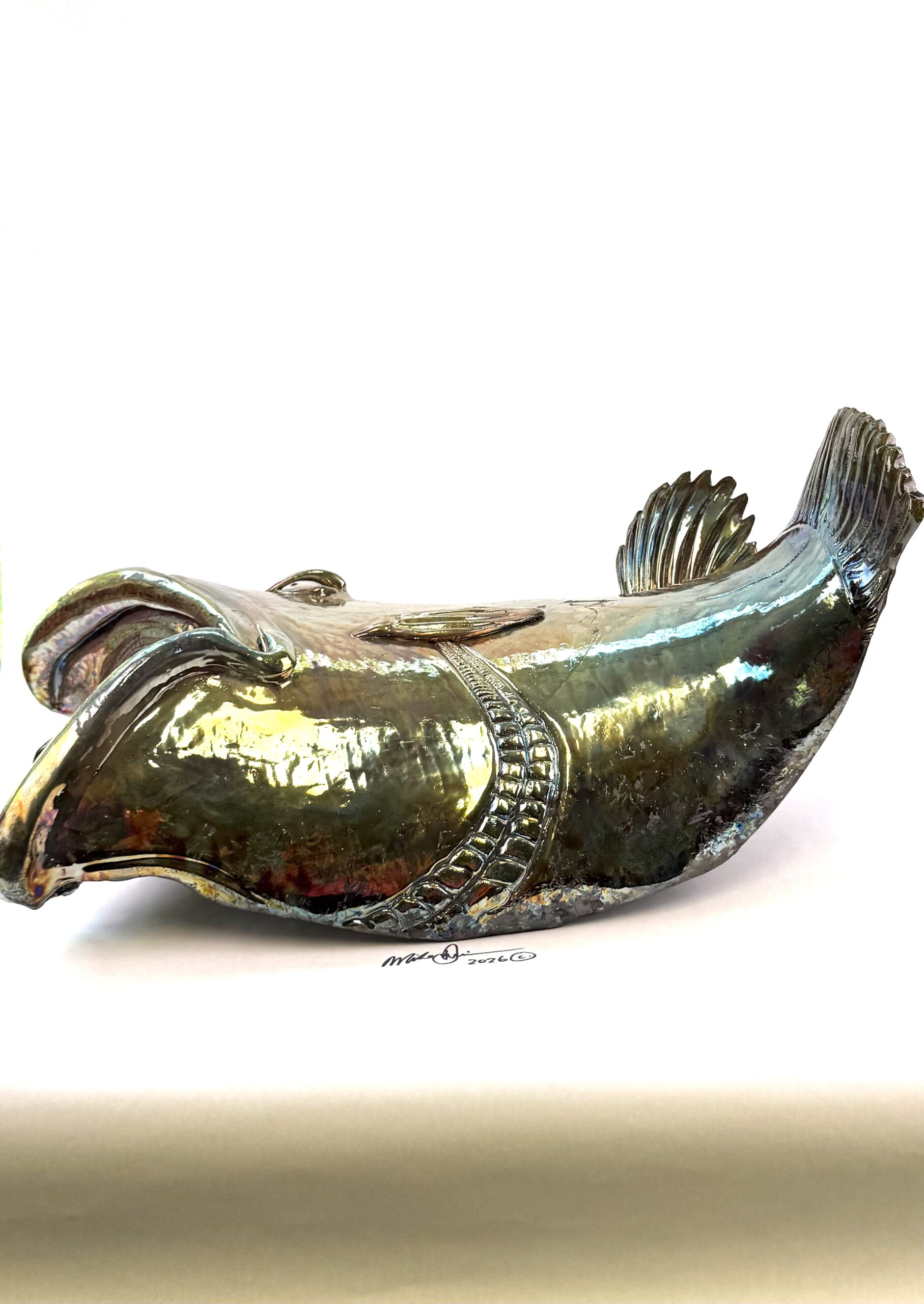 You are looking at a handmade one-off Toothfish with a raku finish and a wild personality. She measures 13″ x 8” x 3” and hangs on the wall with a built-in hanger. Shes sporting a custom finish designed for indoor use or outside without cover.