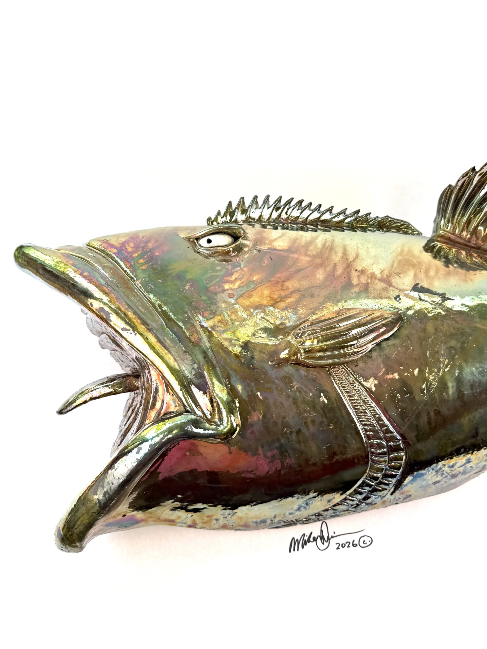 This piece is designed and created by artist Mike Quinn, it’s part of his Fish with Attitude collection. It’s one-of-a-kind nature means it will have unique markings, design, spots, teeth, fur, claws or whatever is applicable to the creature posted.