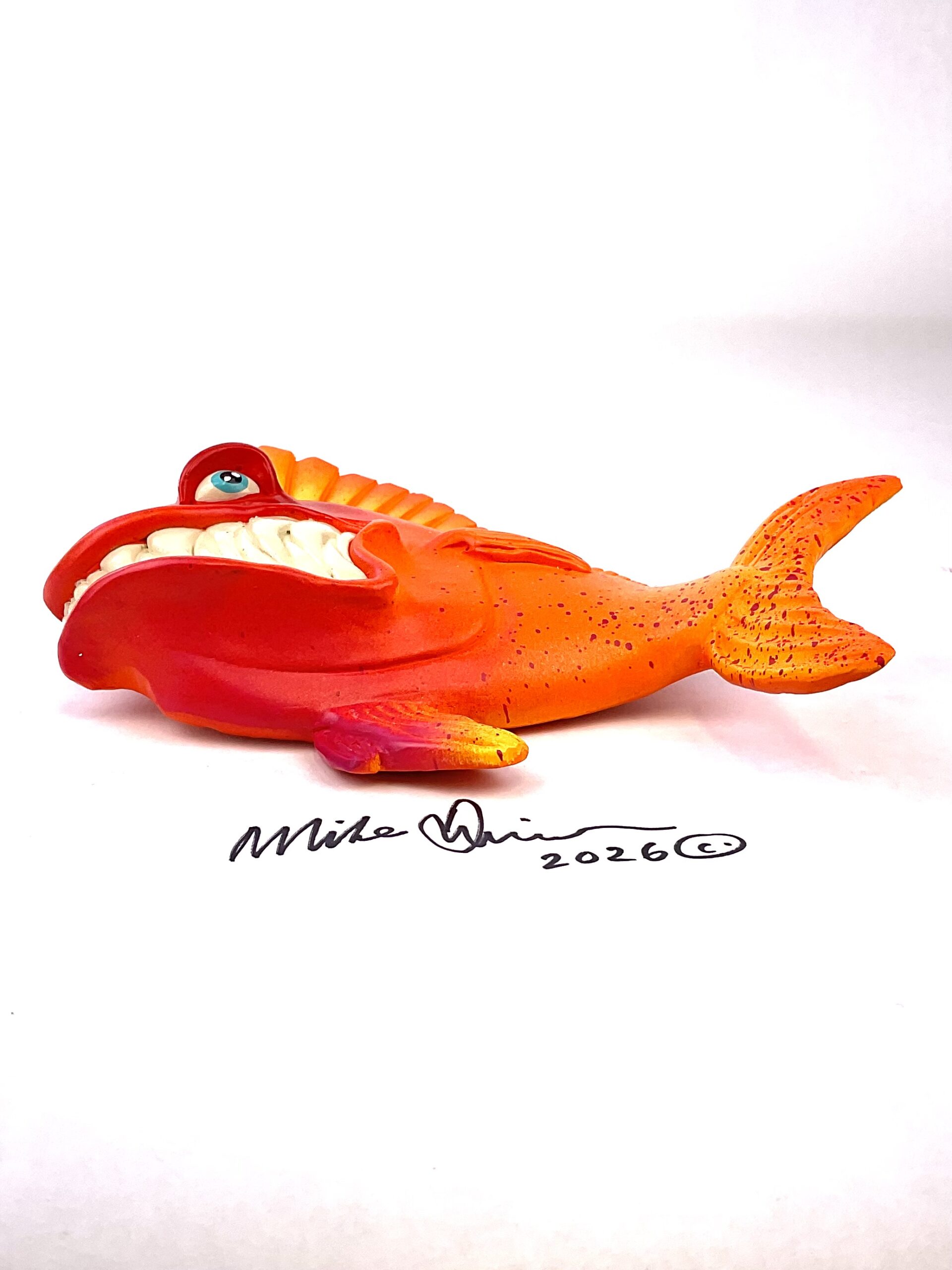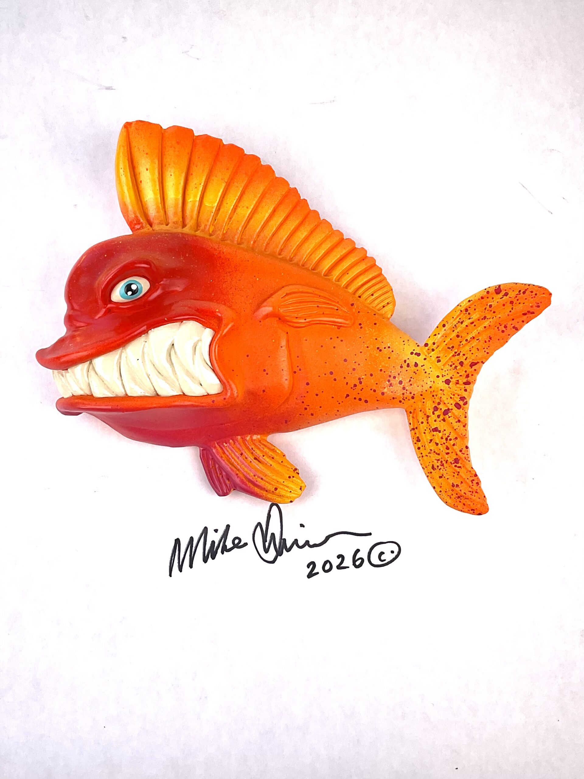 This piece is designed and created by artist Mike Quinn, it’s part of his Fish with Attitude collection. It’s one of a kind nature means it will have unique markings, design, spots, teeth, fur, claws or whatever is applicable to the creature posted.