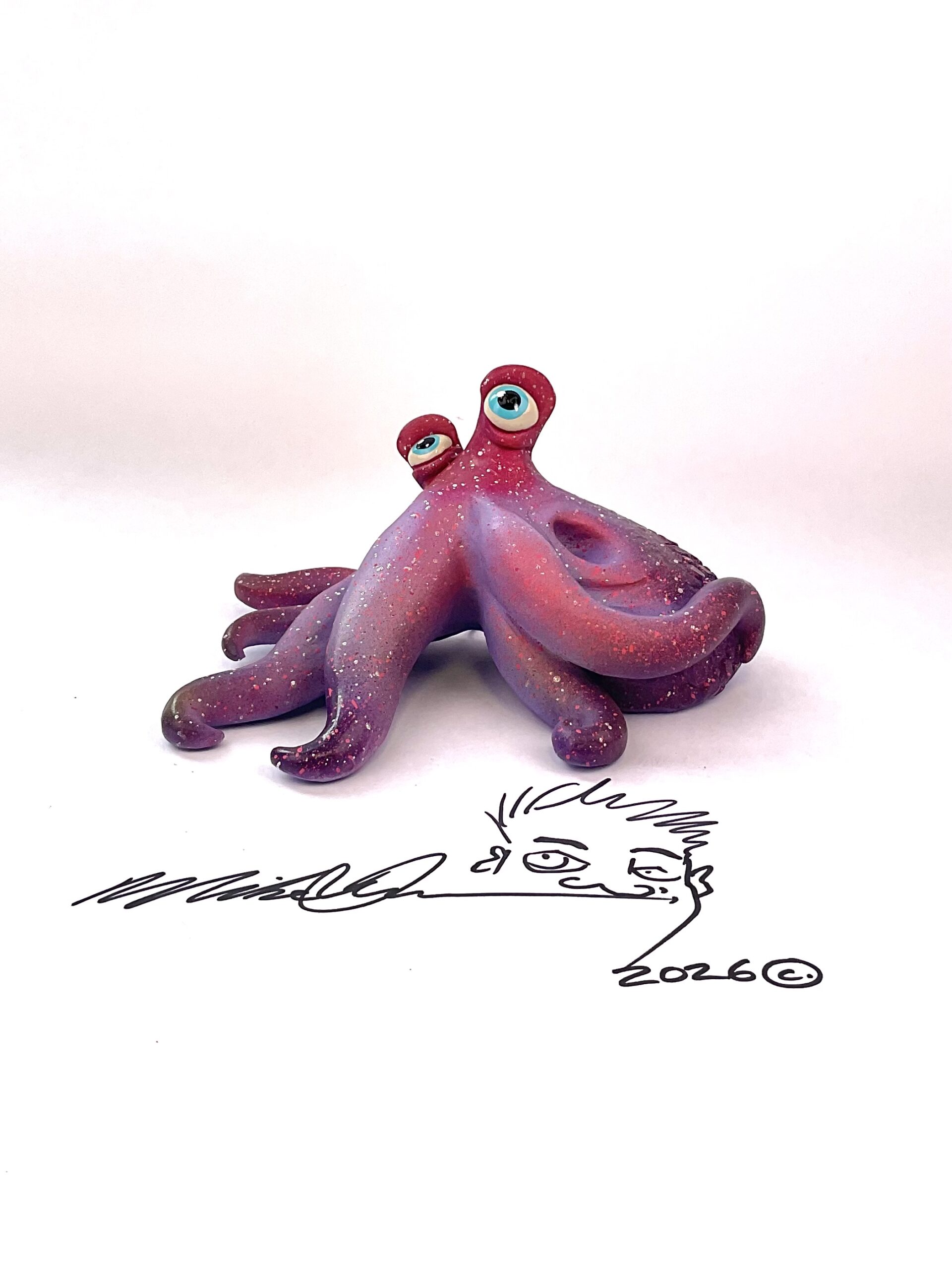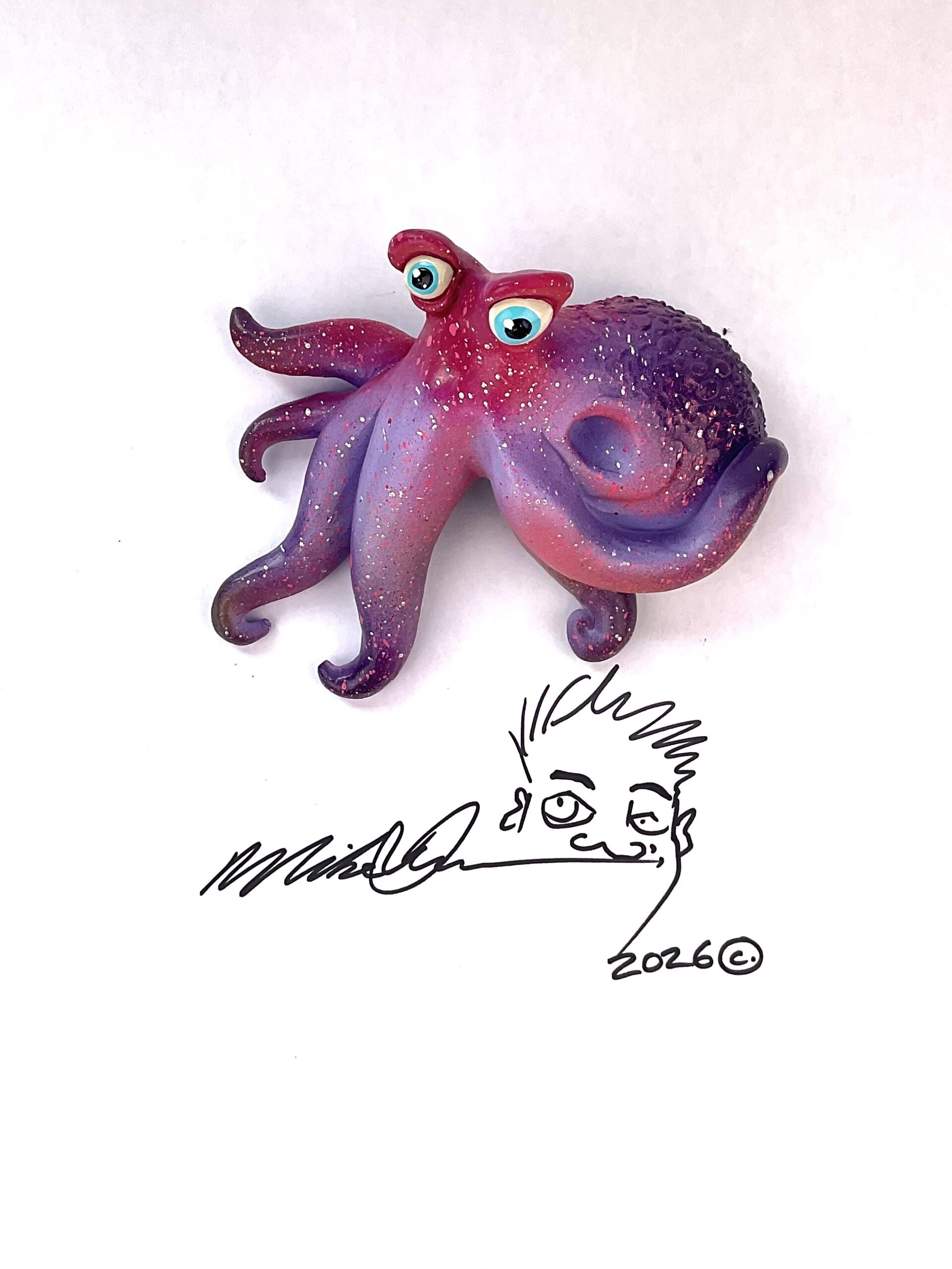 This snazzy octopus is named “Bernardo”, he features a shifty look, fabulous tentacles, and some serious charm. Bernardo measures 7.5″ x 5.5″ x 4″ and hangs on the wall with a built-in hook. He’s sporting a hand-painted custom finish that is designed for indoor use or outside in a protected/covered area.