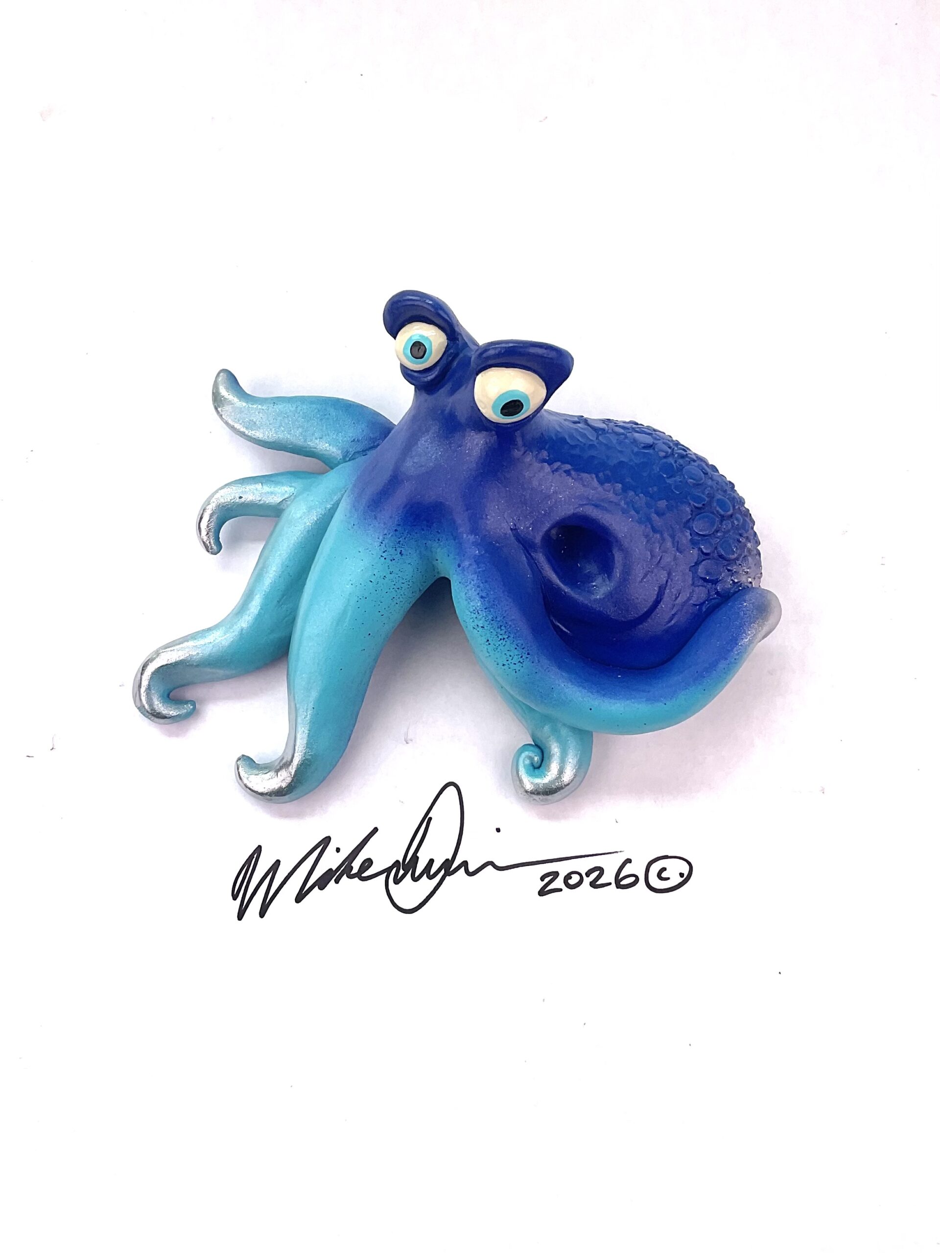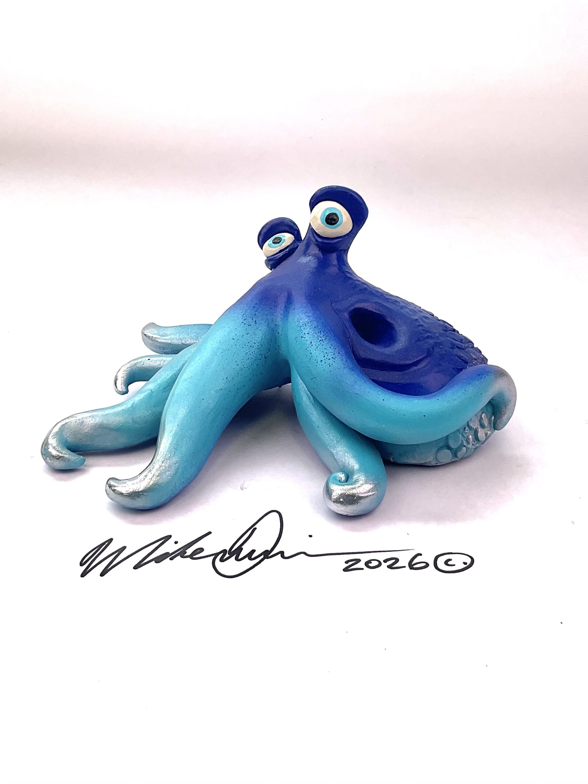 This snazzy octopus is named “Bernardo”, he features a shifty look, fabulous tentacles, and some serious charm. Bernardo measures 7.5″ x 5.5″ x 4″ and hangs on the wall with a built-in hook. He’s sporting a hand-painted custom finish that is designed for indoor use or outside in a protected/covered area.
