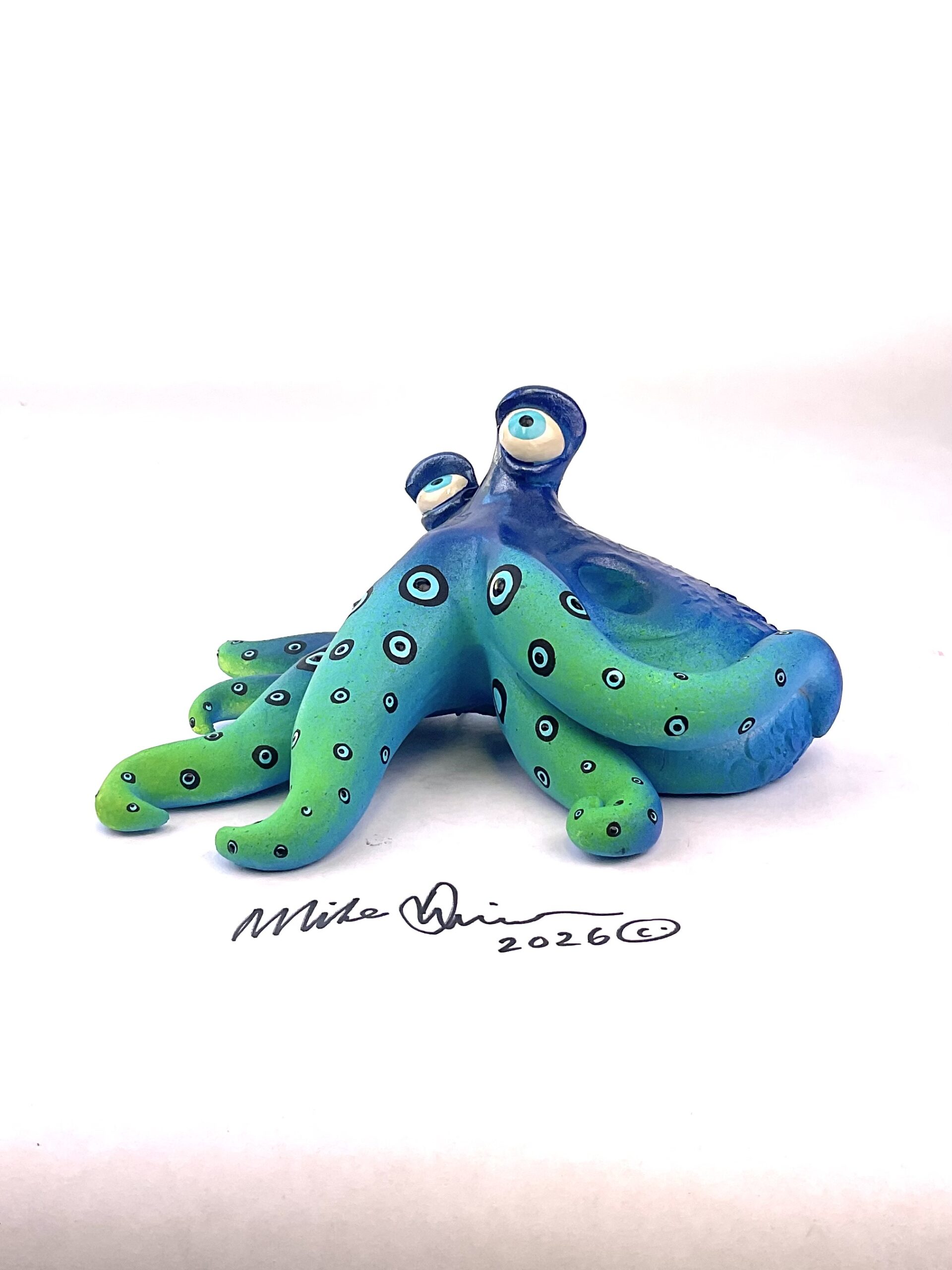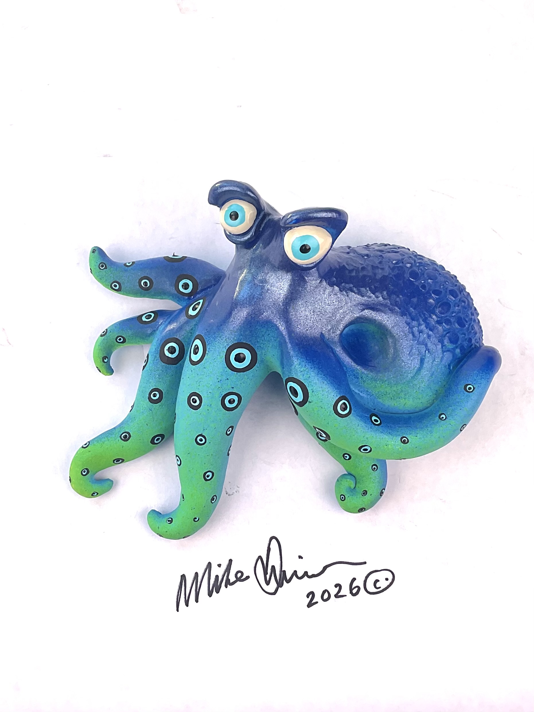 This snazzy octopus is named “Bernardo”, he features a shifty look, fabulous tentacles, and some serious charm. Bernardo measures 7.5″ x 5.5″ x 4″ and hangs on the wall with a built-in hook. He’s sporting a hand-painted custom finish that is designed for indoor use or outside in a protected/covered area.