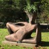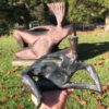 Henrietta is 85.5″ tall x 26″ wide, x 96″ long and features a copper clad 4′ x 8′ x 6′ base designed by hand. The corners of the base are reinforced and she has 600# casters under there…isn’t that spiffy? The base has about an inch of clearance so moving her around on the side of a mountain is probably out of the question. The backside has almost a tribal feel carved into the sculpture. Atop her marvelous head is a built in planter. She has a carved foam core with a fiberglass and epoxy resin finish, she also sports exterior paint. This Stunt Sculpture has a finish that is designed for indoor or outdoor use. Henrietta features a custom hand painted faux bronze finish.