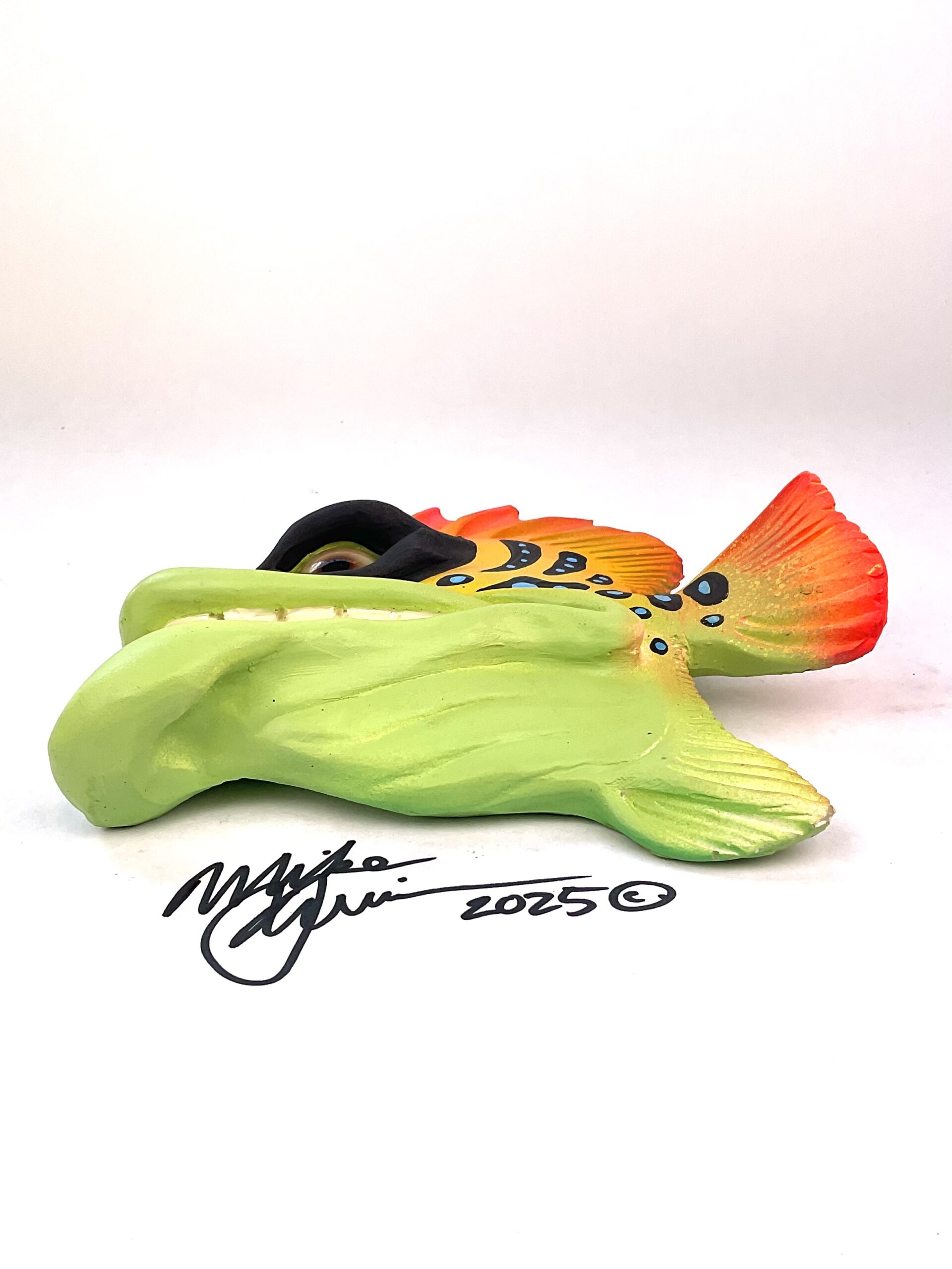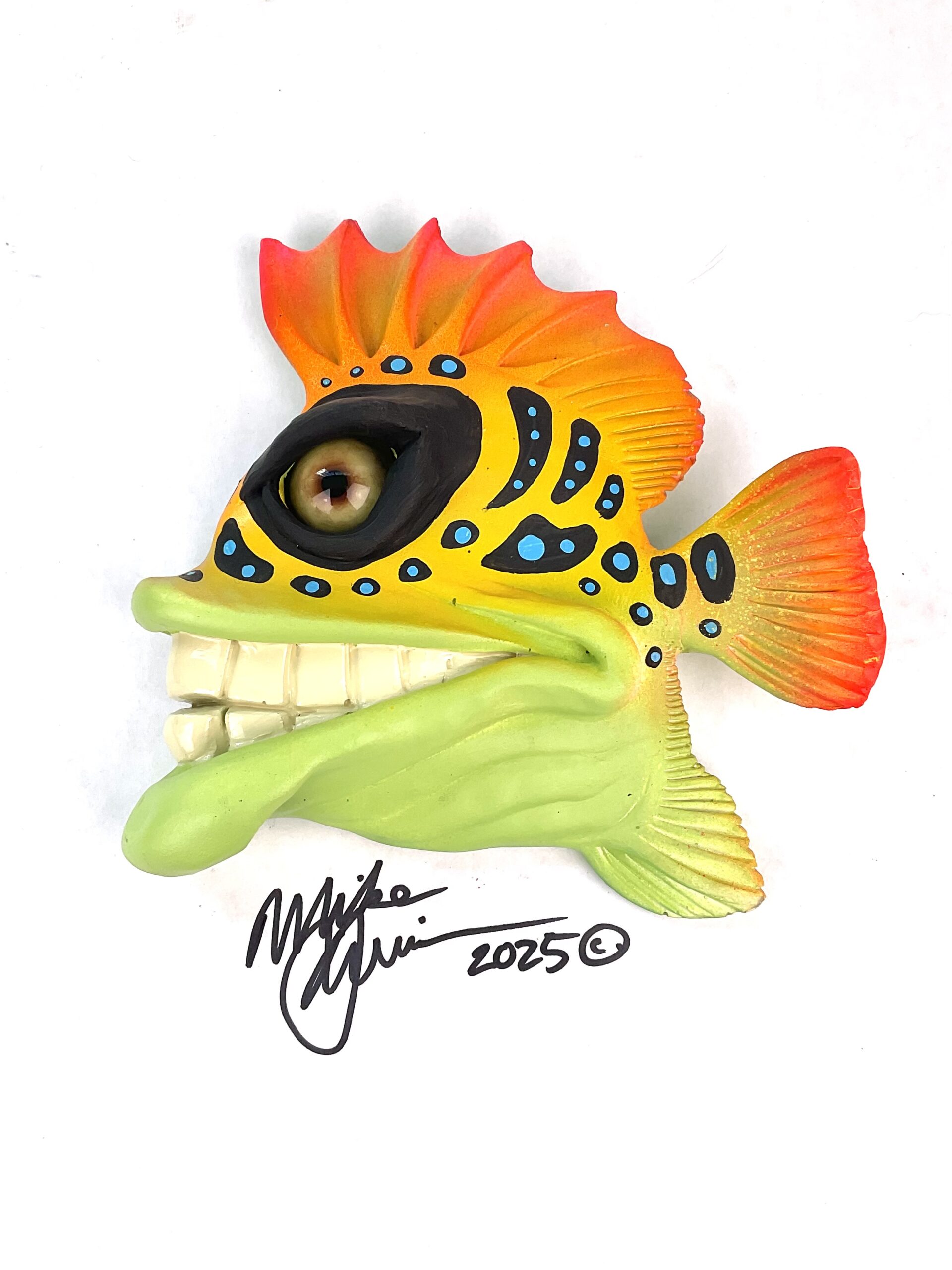 This piece is designed and created by artist Mike Quinn, it’s part of his Fish with Attitude collection. It’s one of a kind nature means it will have unique markings, design, spots, teeth, fur, claws or whatever is applicable to the creature posted.
