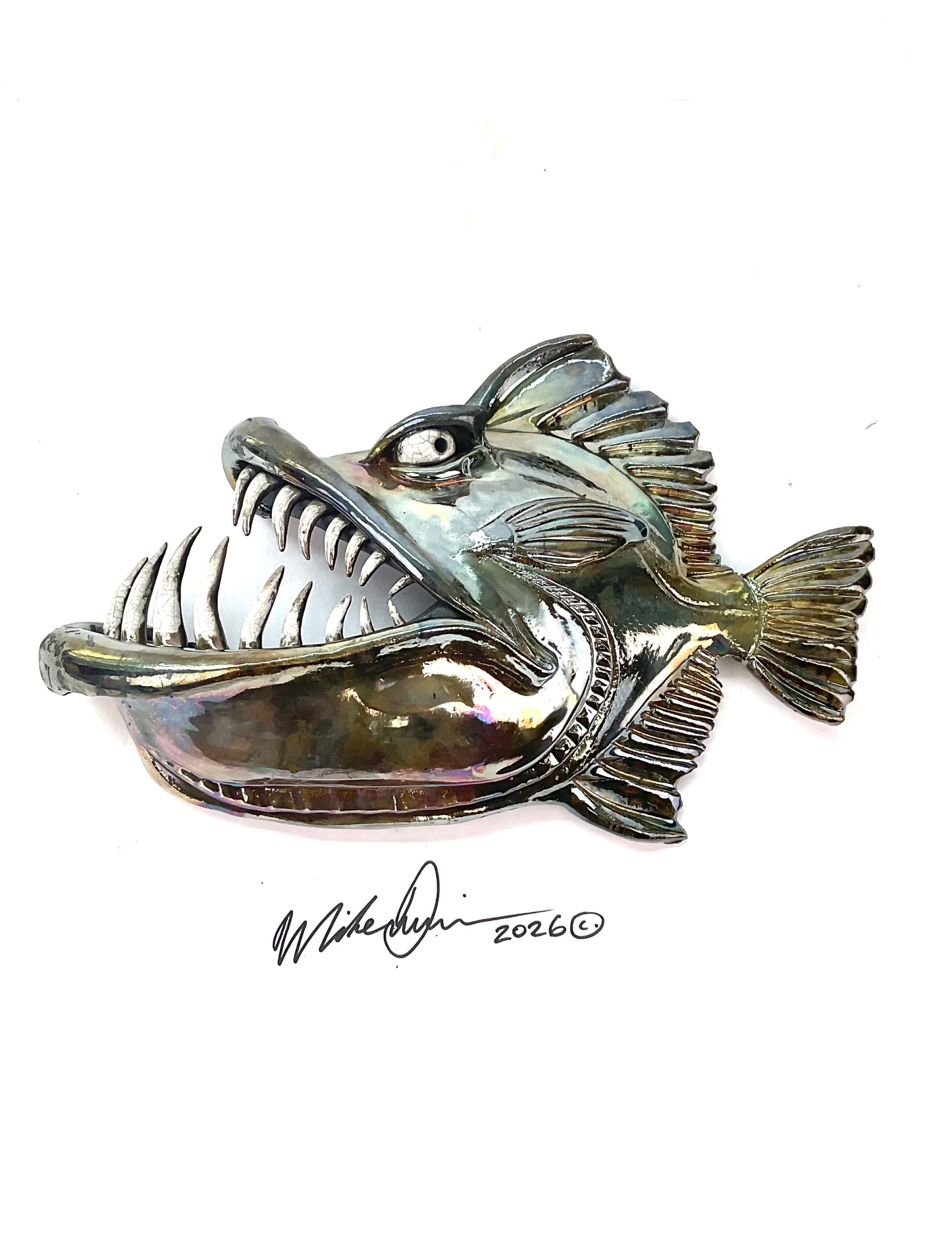 You are looking at a handmade one-off Toothfish with a raku finish and a wild personality. She measures 13″ x 8” x 3” and hangs on the wall with a built-in hanger. Shes sporting a custom finish designed for indoor use or outside without cover.