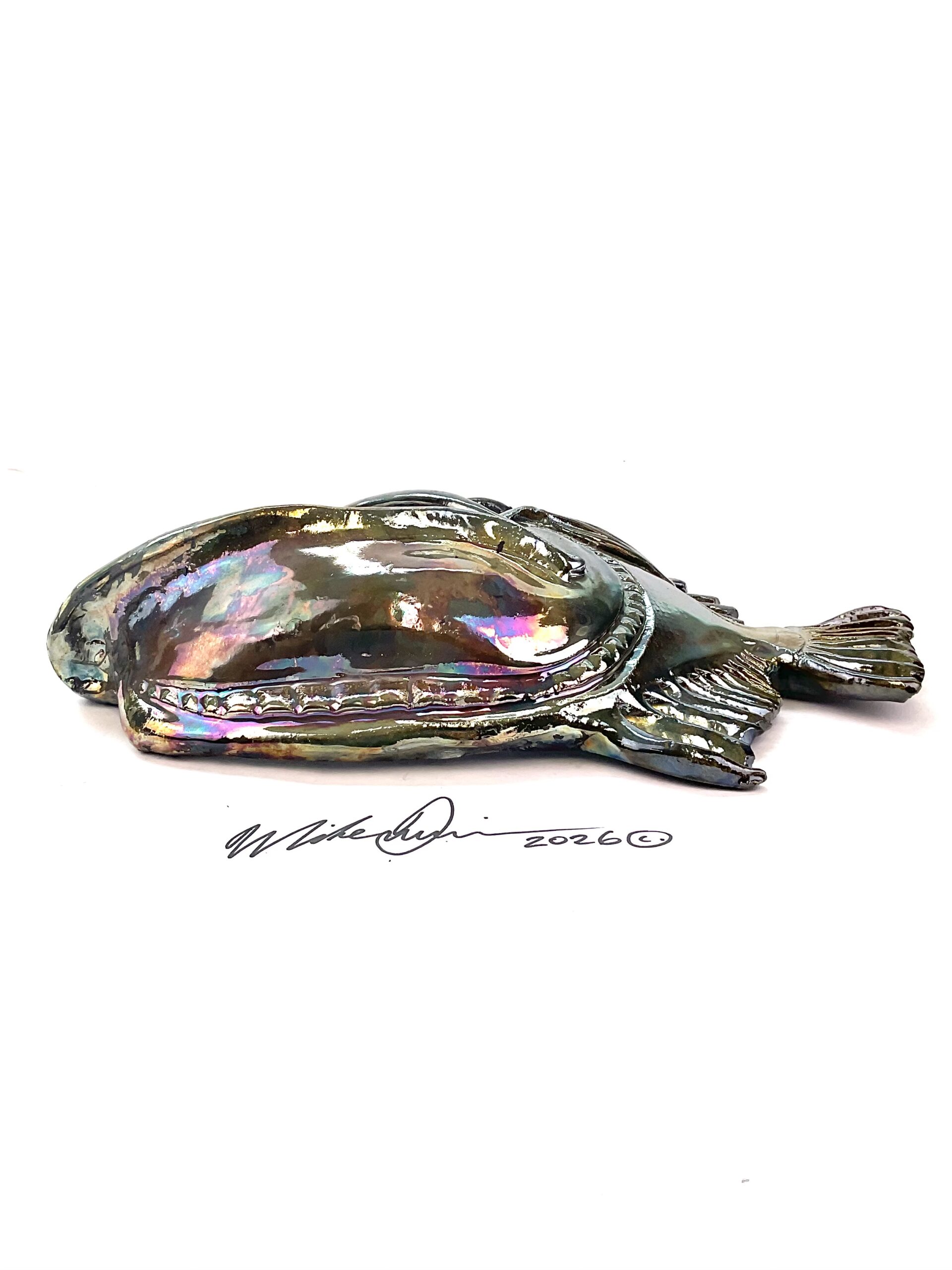 This piece is designed and created by artist Mike Quinn, it’s part of his Fish with Attitude collection. It’s one-of-a-kind nature means it will have unique markings, design, spots, teeth, fur, claws or whatever is applicable to the creature posted.