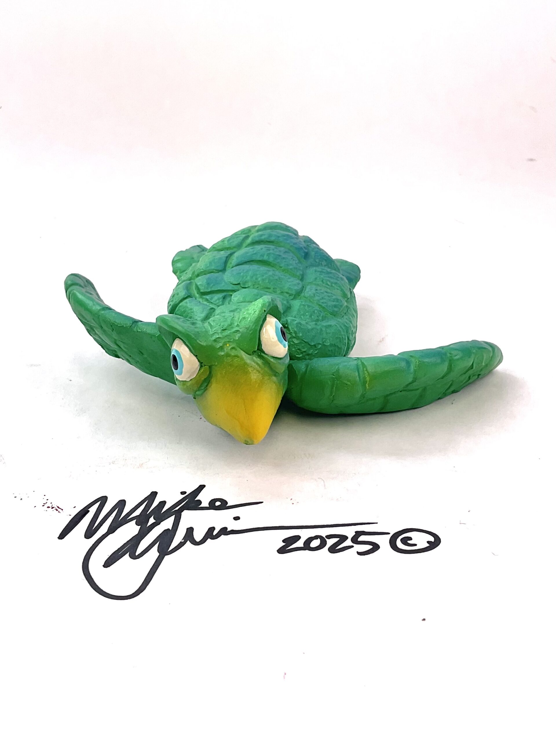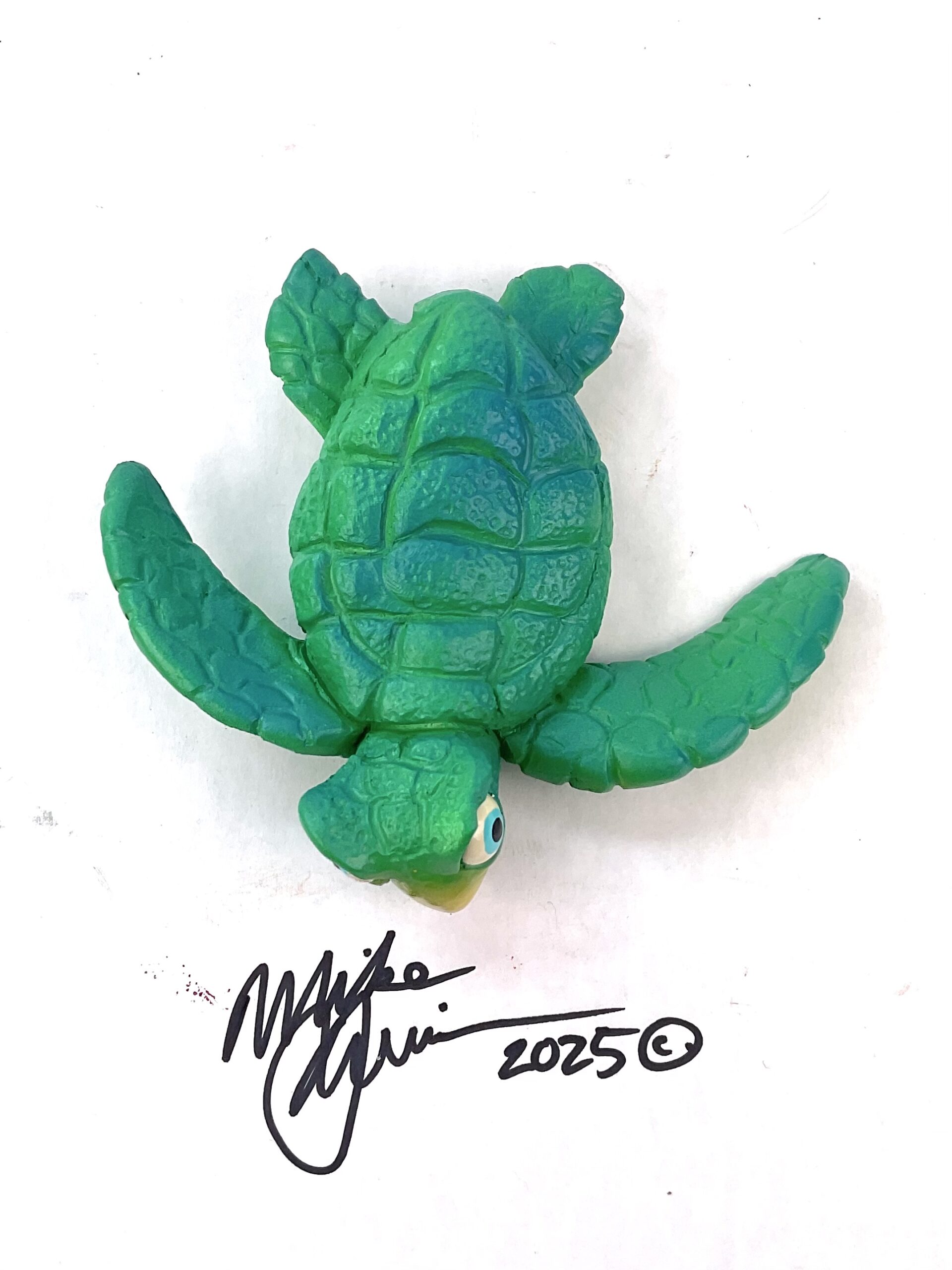 Little Ricky is quite famous for surfing the undertows near the big reef! The detailed fins, shell, and face of this guy make him a “Must Have” for collectors. He measures 5″ x 6″ and hangs on the wall with a built-in hook. He’s sporting a hand-painted custom finish that is designed for indoor use or outside in a protected/covered area.
