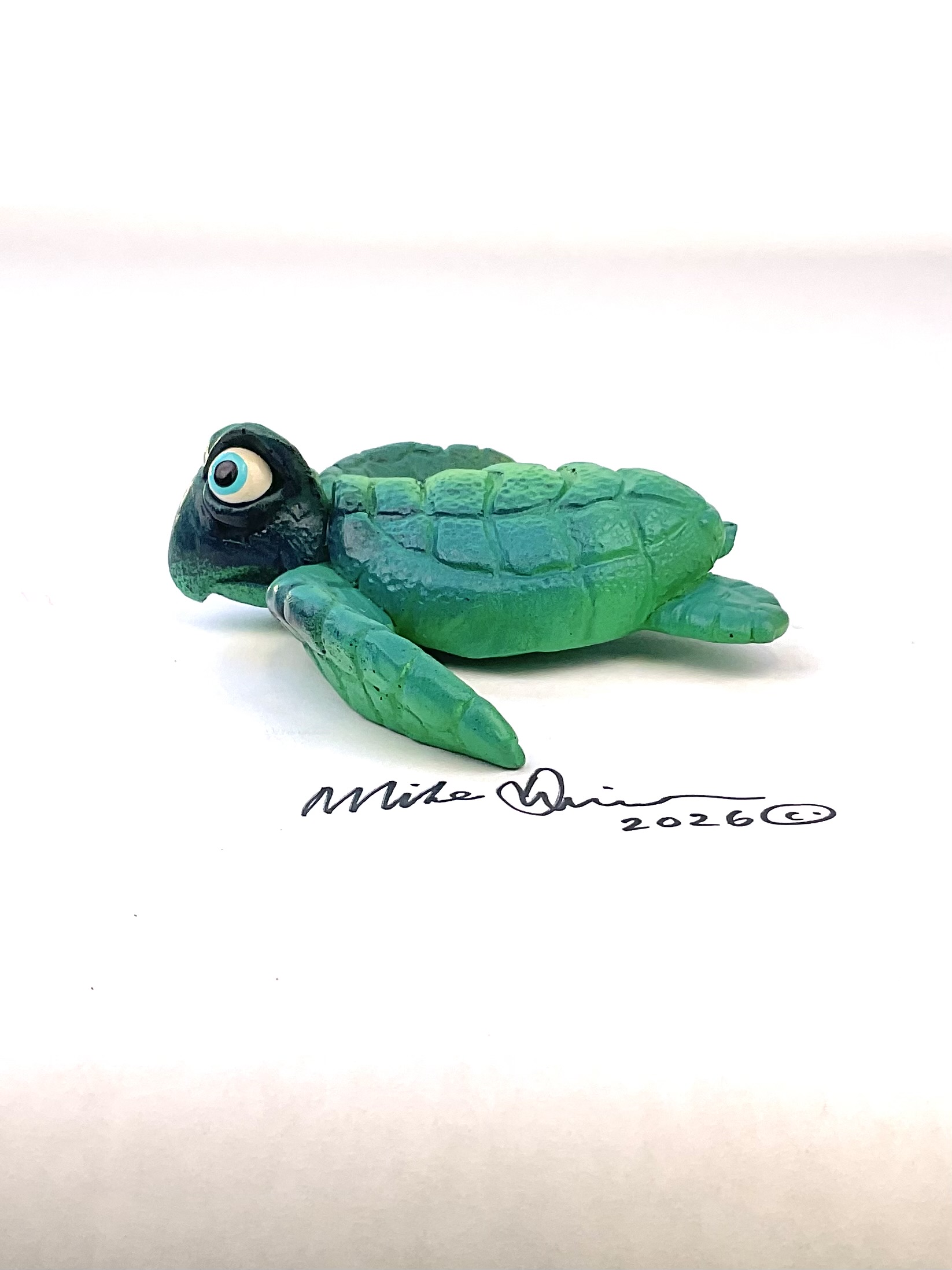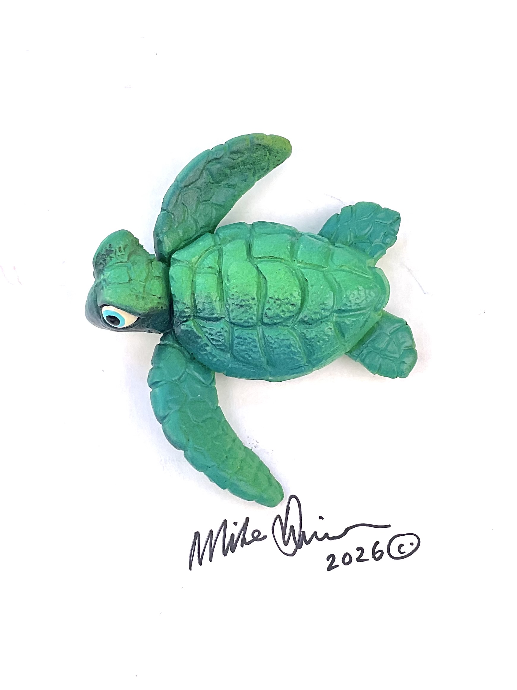 Little Ricky is quite famous for surfing the undertows near the big reef! The detailed fins, shell, and face of this guy make him a “Must Have” for collectors. He measures 5″ x 6″ and hangs on the wall with a built-in hook. He’s sporting a hand-painted custom finish that is designed for indoor use or outside in a protected/covered area.