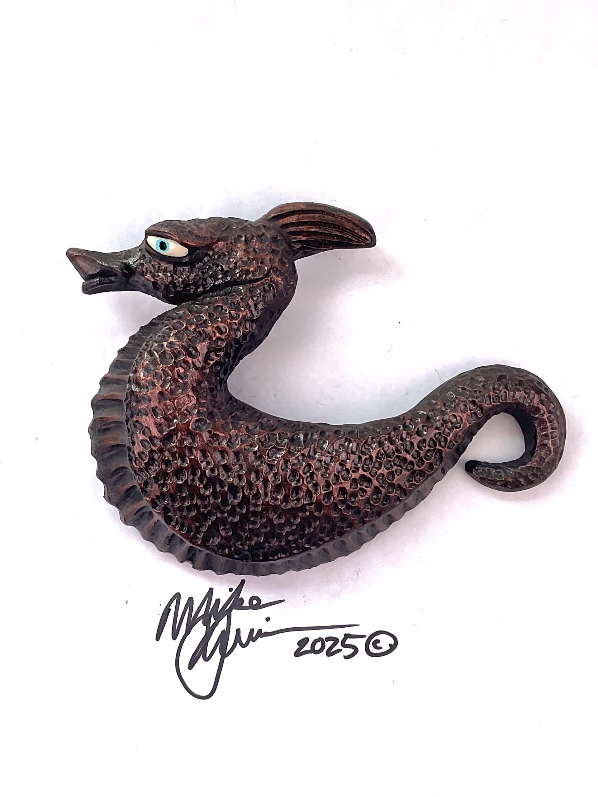 This piece is designed and created by artist Mike Quinn, it’s part of his Fish with Attitude collection. It’s one of a kind nature means it will have unique markings, design, spots, teeth, fur, claws or whatever is applicable to the creature posted.