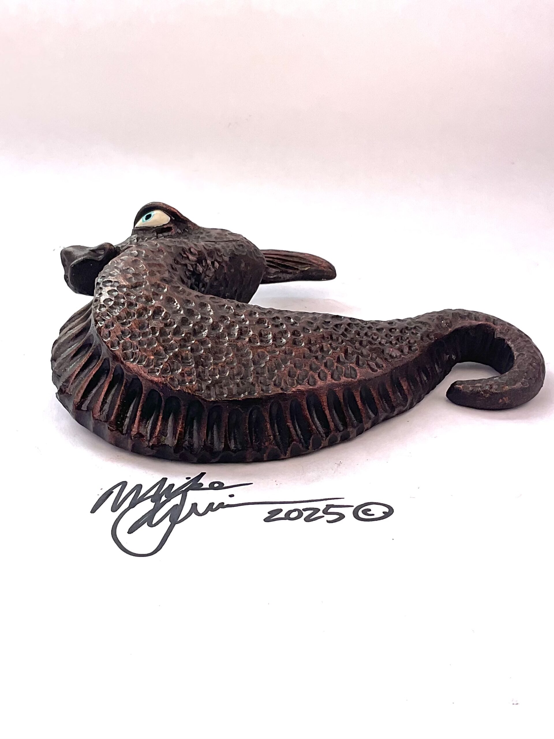 Mammajo is a serious seahorse, She’s in charge of the biggest school on the reef. That may seem like fun, but the kids keep trying to eat each other….explain that to the parents! Mammajo measures 8″ x 6″ and hangs on the wall with a built in eyelet. She’s sporting a hand painted custom finish that is designed for indoor use or outside in a protected/covered area.