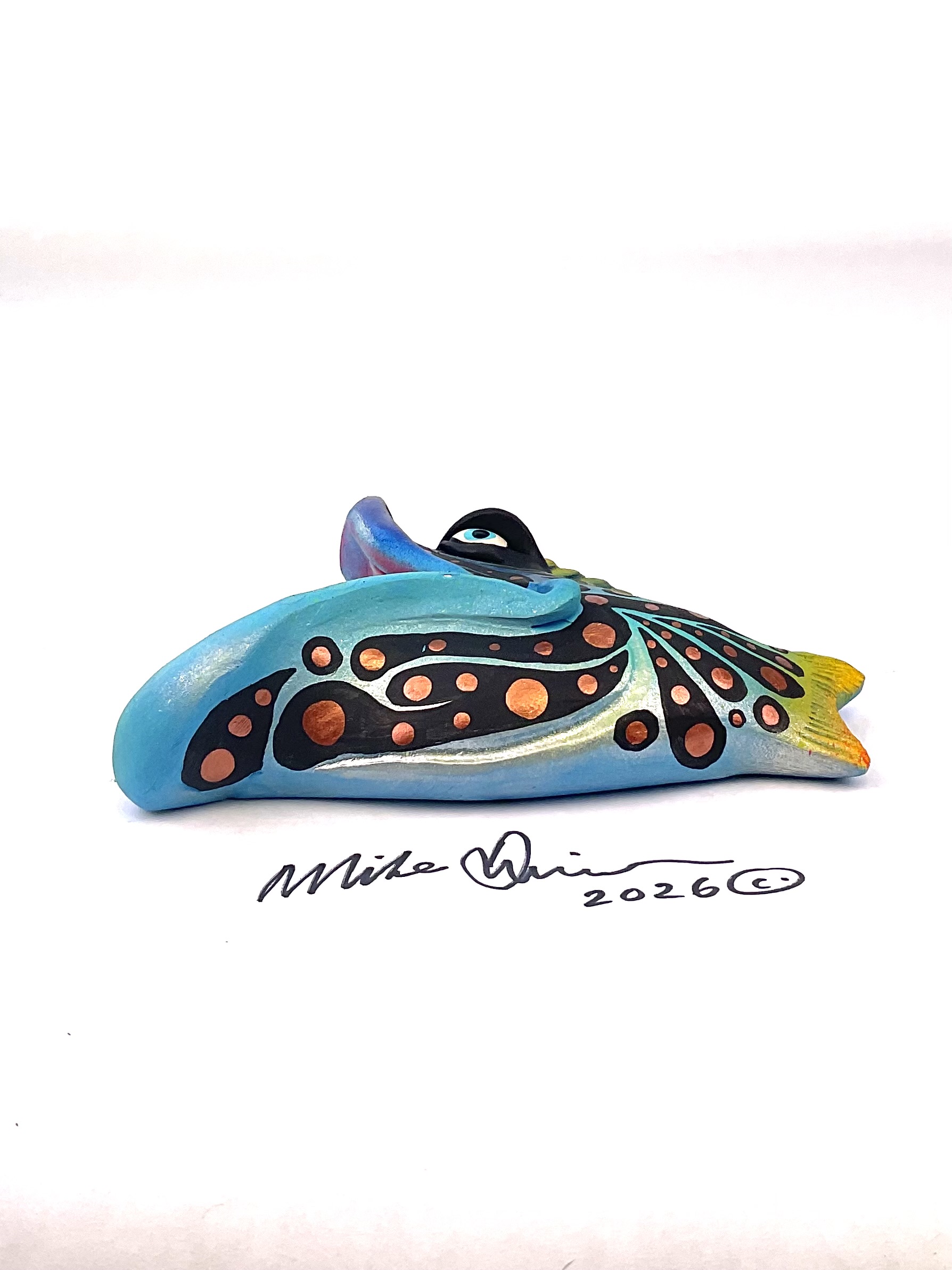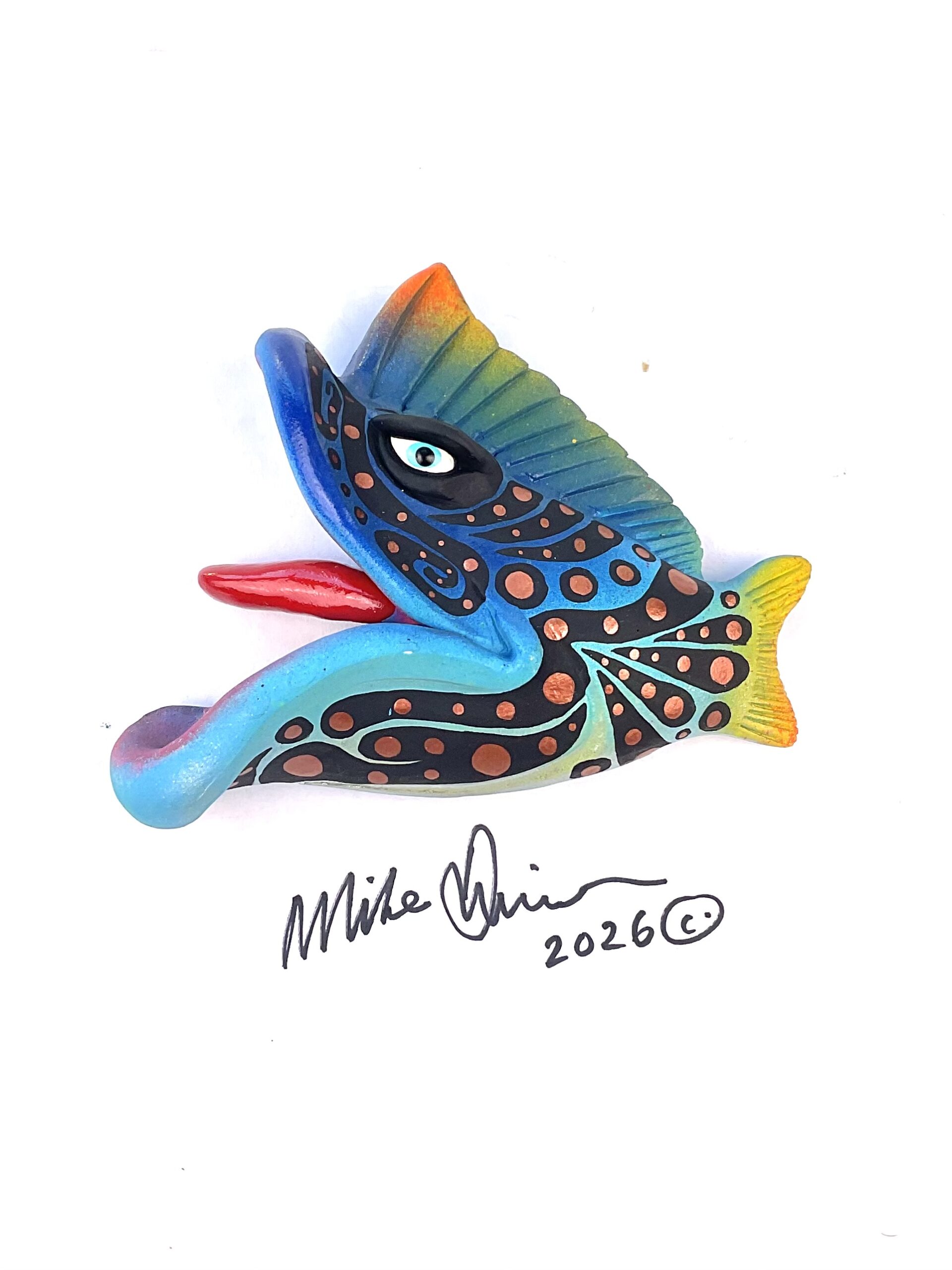 This piece is designed and created by artist Mike Quinn, it’s part of his Fish with Attitude collection. It’s one of a kind nature means it will have unique markings, design, spots, teeth, fur, claws or whatever is applicable to the creature posted.
