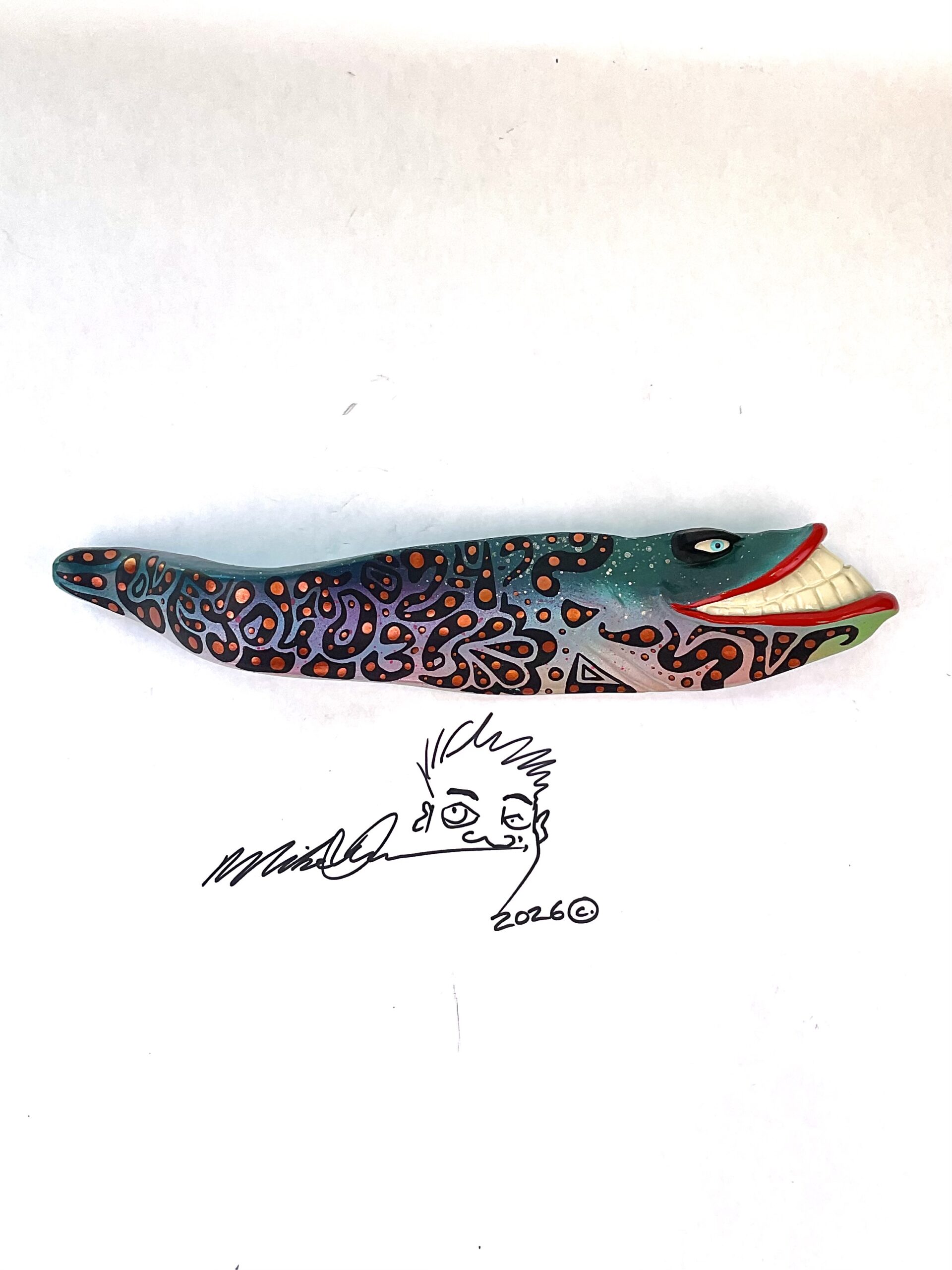 This piece is designed and created by artist Mike Quinn, it’s part of his Fish with Attitude collection. It’s one of a kind nature means it will have unique markings, design, spots, teeth, fur, claws or whatever is applicable to the creature posted.