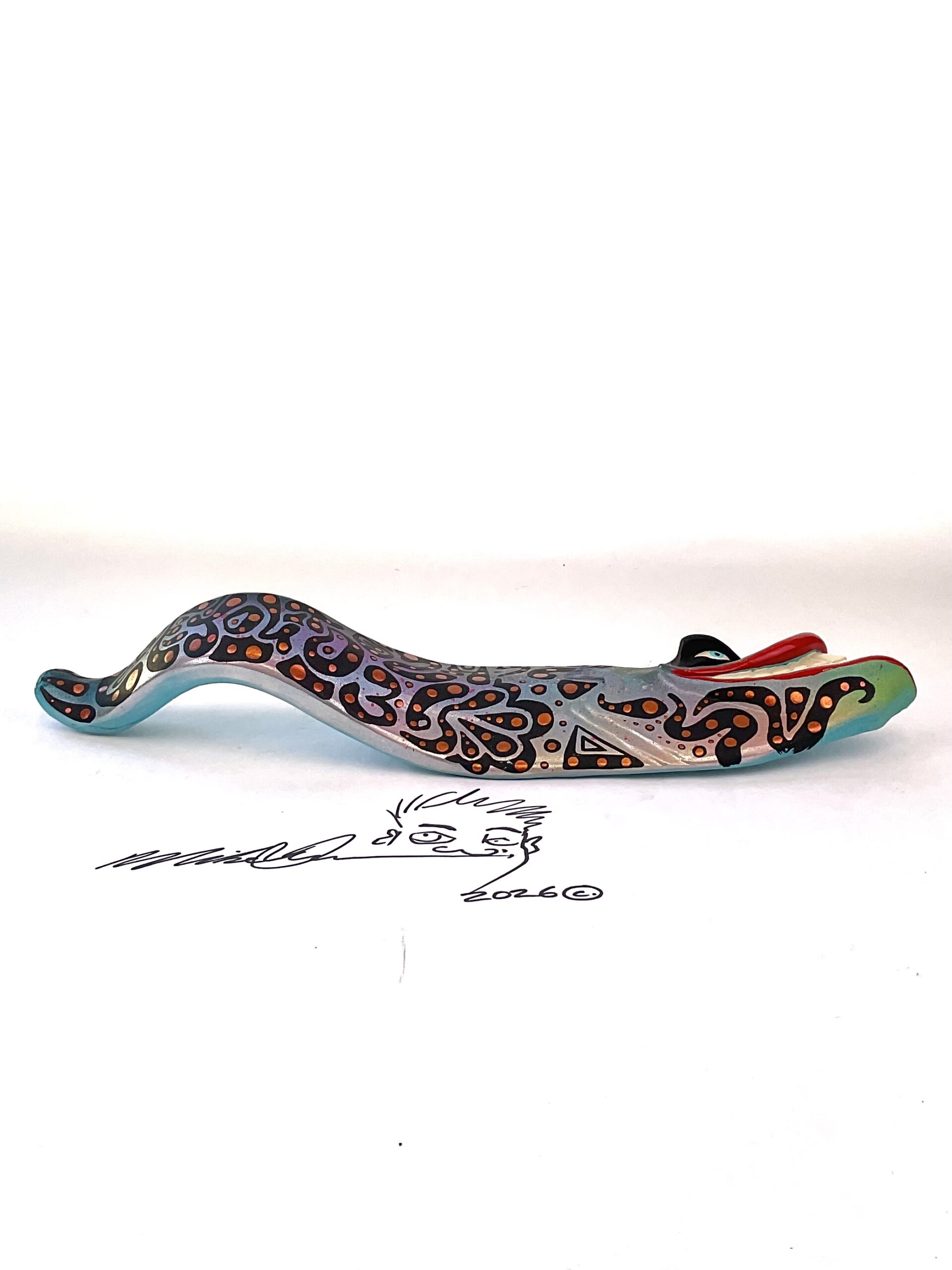 This snazzy electric eel is named “Mighty Mike”, A one time world weightlifting champion…his career ended after a devastating hernia injury in 1980. He took up pea-knuckle, and is currently dominating the southwest with his electric personality. He measures 15″ x 3″ and hangs on the wall with a built-in hook. He’s sporting a hand-painted custom finish that is designed for indoor use or outside in a protected/covered area.