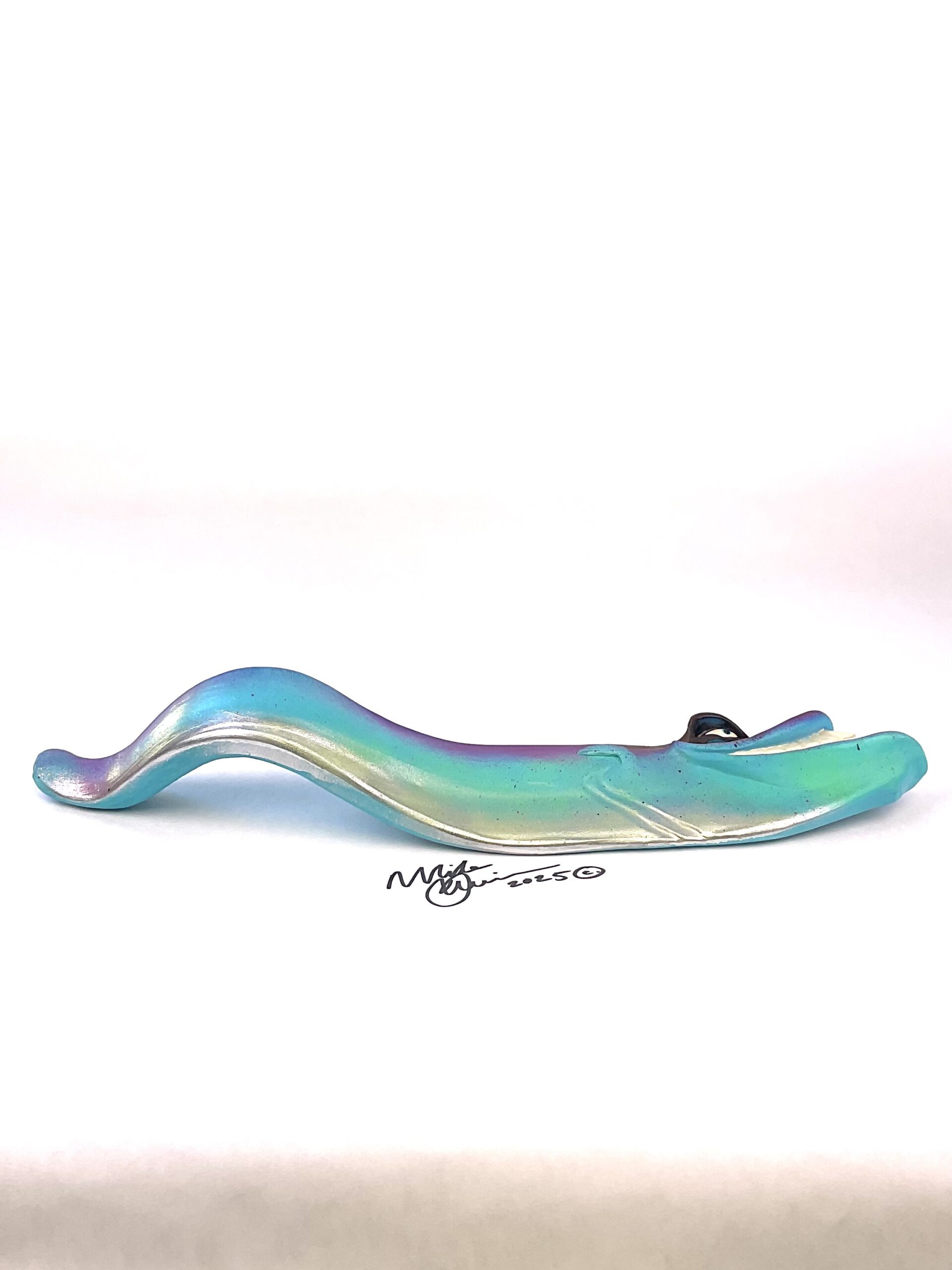 This snazzy electric eel is named “Mighty Mike”, A one time world weightlifting champion…his career ended after a devastating hernia injury in 1980. He took up pea-knuckle, and is currently dominating the southwest with his electric personality. He measures 15″ x 3″ and hangs on the wall with a built-in hook. He’s sporting a hand-painted custom finish that is designed for indoor use or outside in a protected/covered area.
