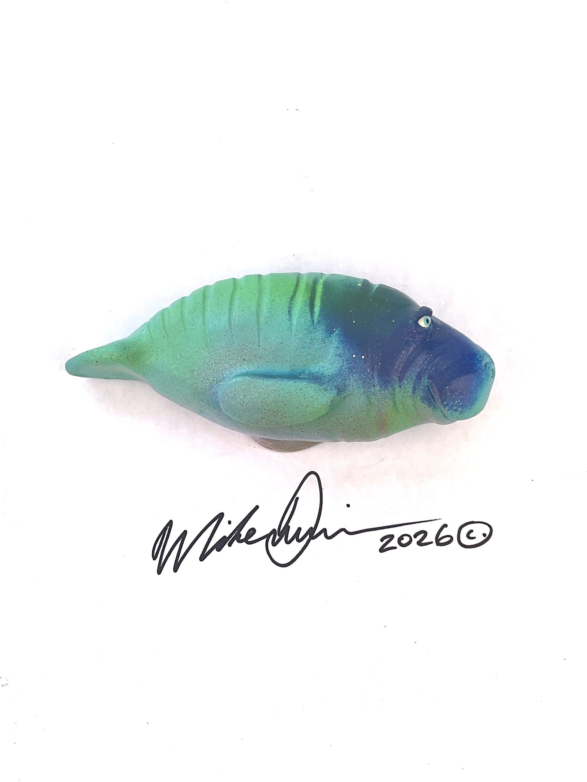 This piece is designed and created by artist Mike Quinn, it’s part of his Fish with Attitude collection. Its one-of-a-kind nature means it will have unique markings, design, spots, teeth, fur, claws or whatever is applicable to the creature posted.