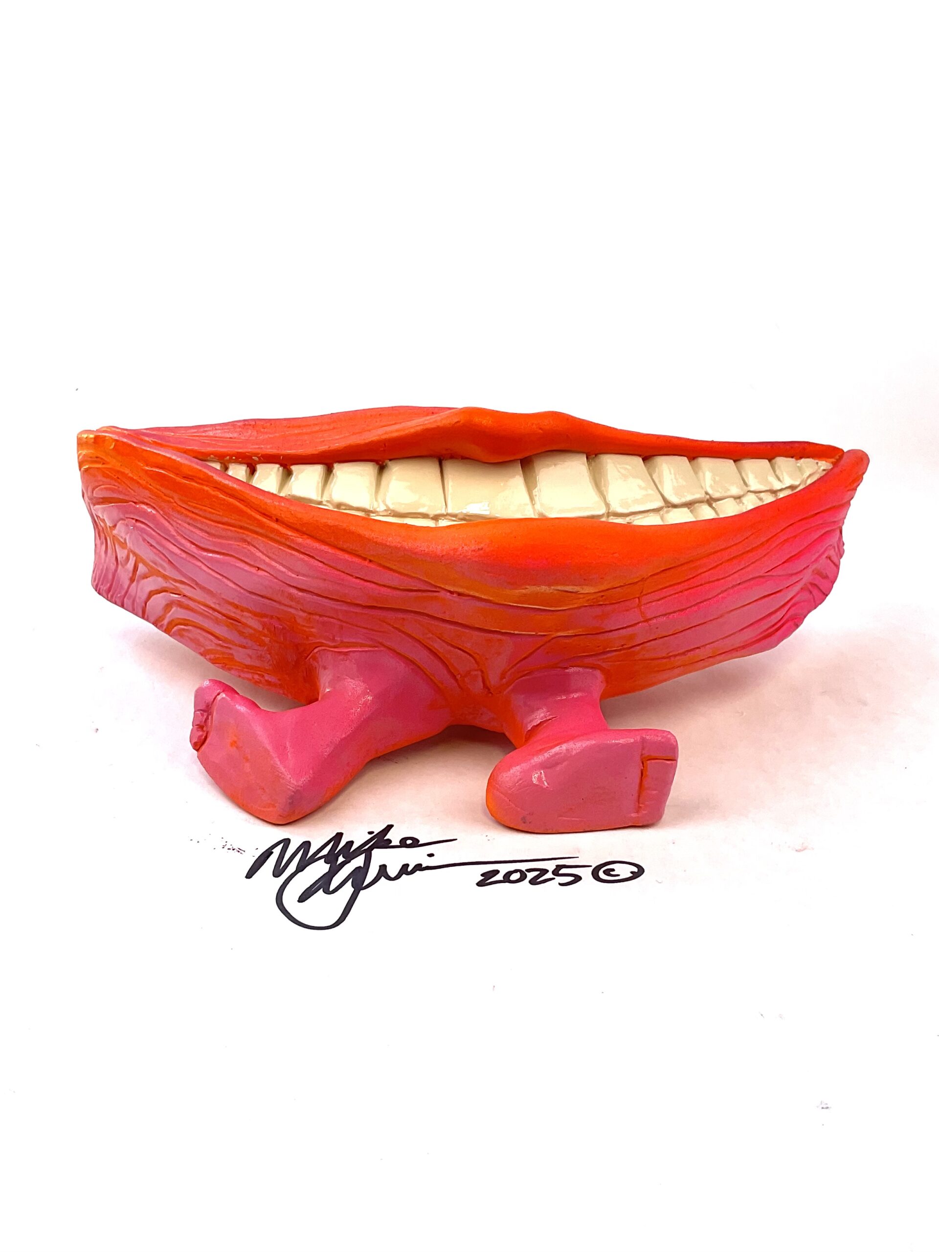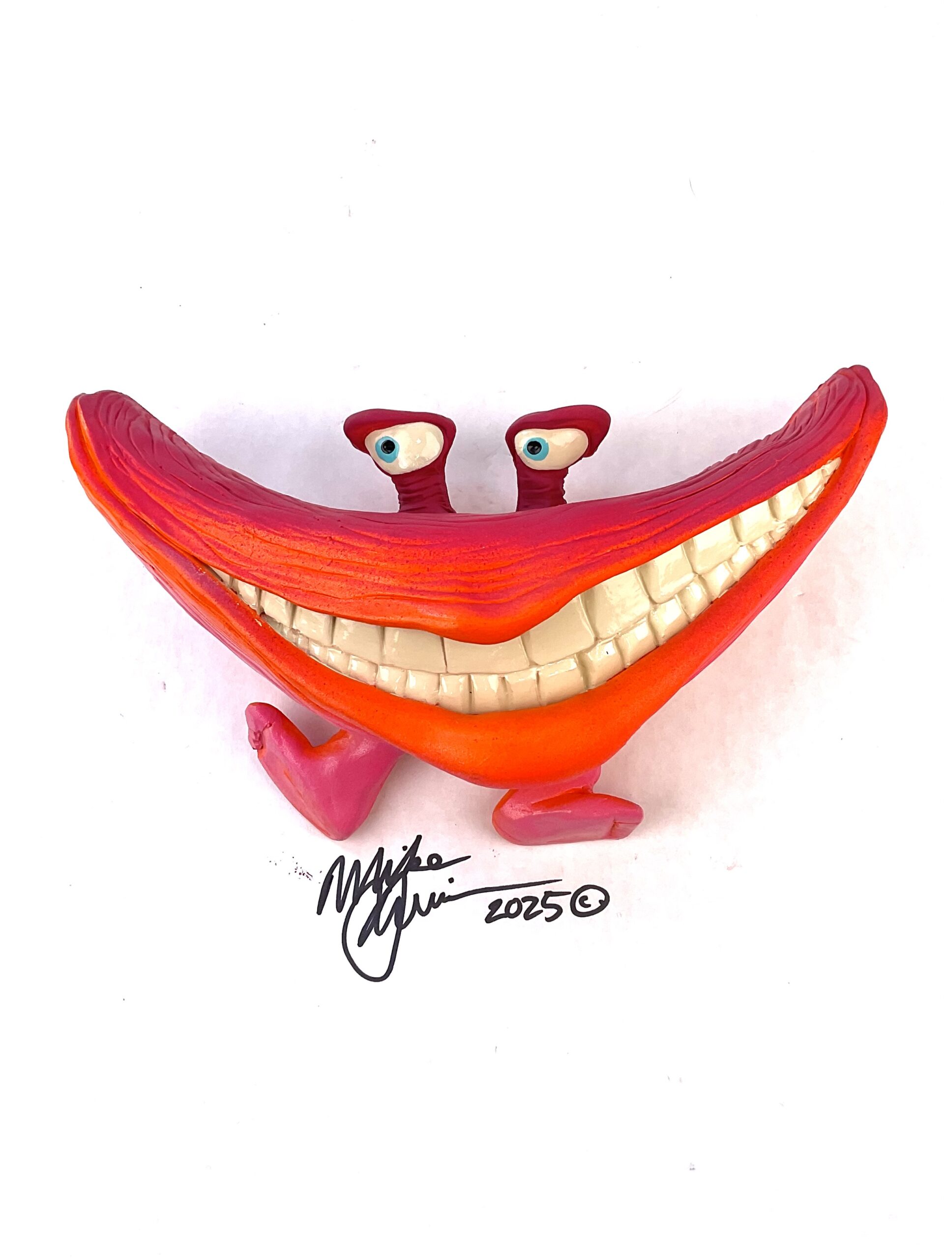 Mr. Happy won the genetic lotto on the reef, years of nuclear waste clean-up have been kind and he grew feet! Now he spends his evenings tap dancing for the locals at the Dance-o-rama. He measures 10.5″ x 5.5″ and hangs on the wall with a built-in hook. He’s sporting a hand-painted custom finish that is designed for indoor use or outside in a protected/covered area.
