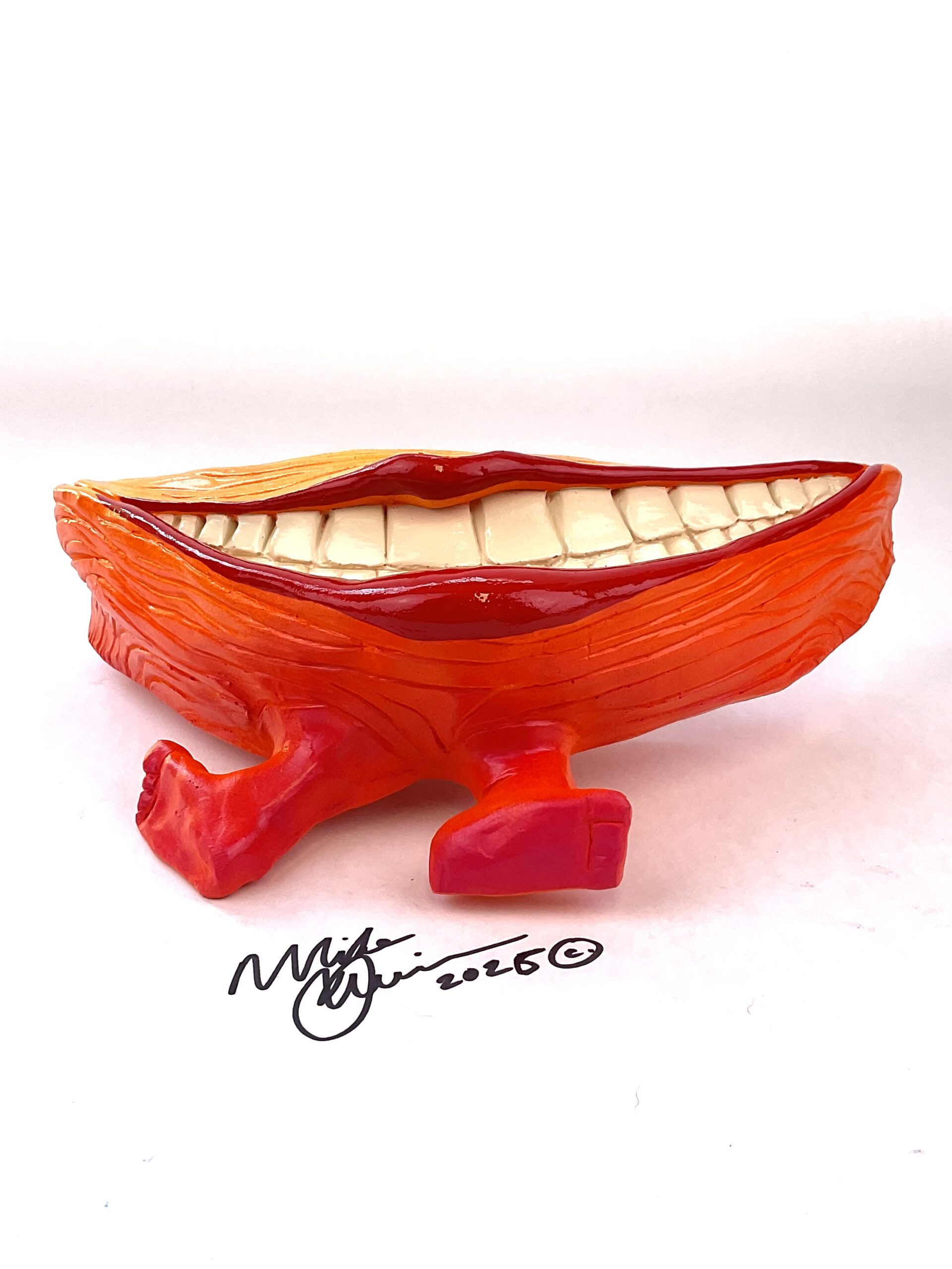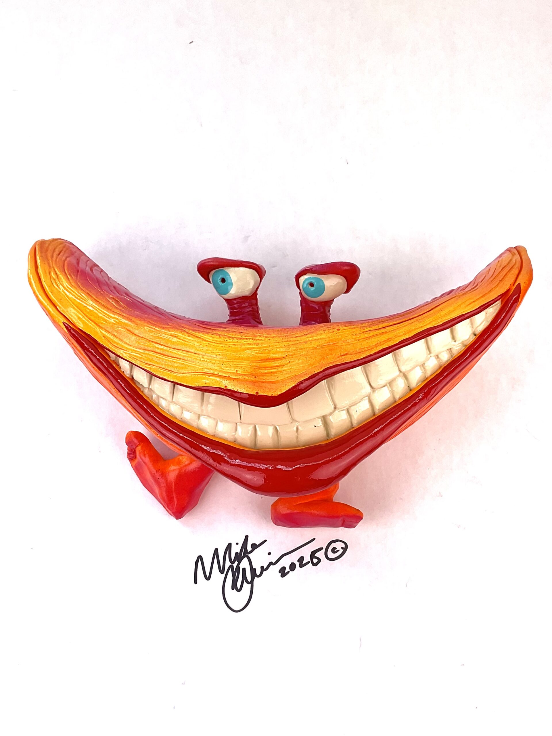 Mr. Happy won the genetic lotto on the reef, years of nuclear waste clean-up have been kind and he grew feet! Now he spends his evenings tap dancing for the locals at the Dance-o-rama.  He measures 10.5″ x 5.5″ and hangs on the wall with a built-in hook. He’s sporting a hand-painted custom finish that is designed for indoor use or outside in a protected/covered area.