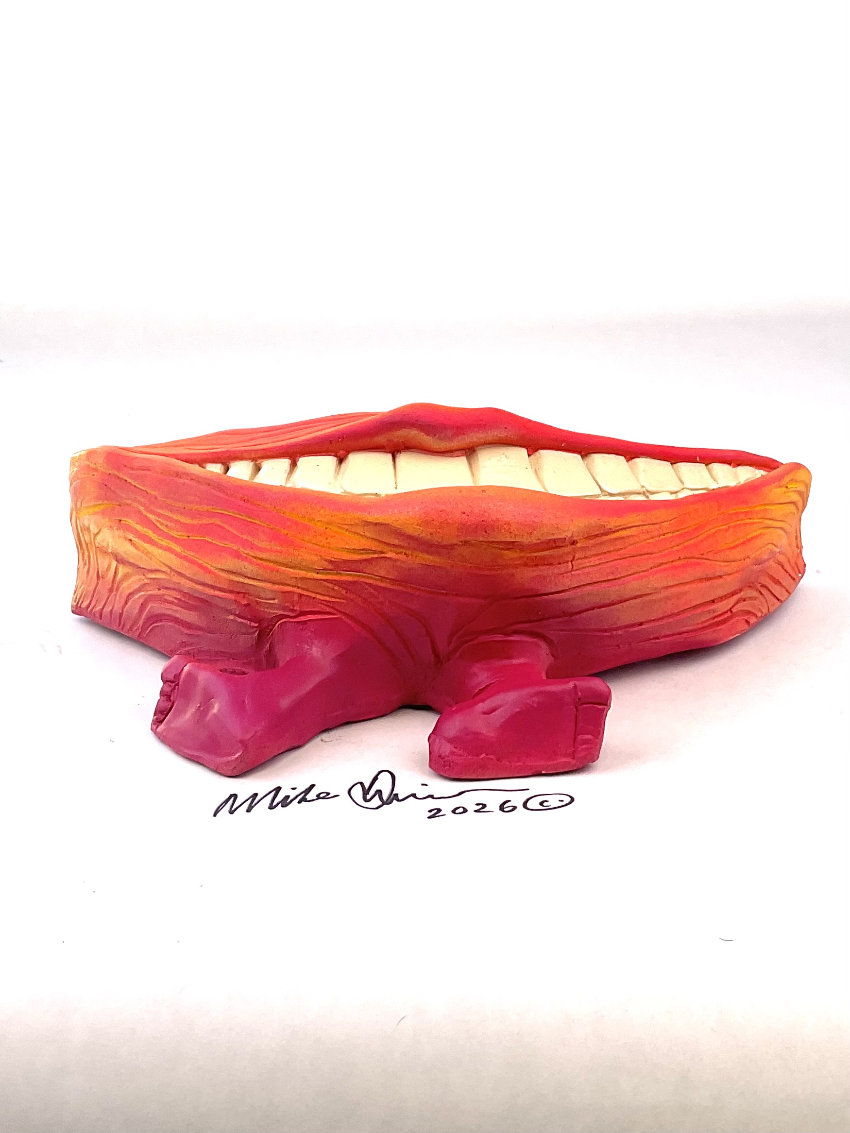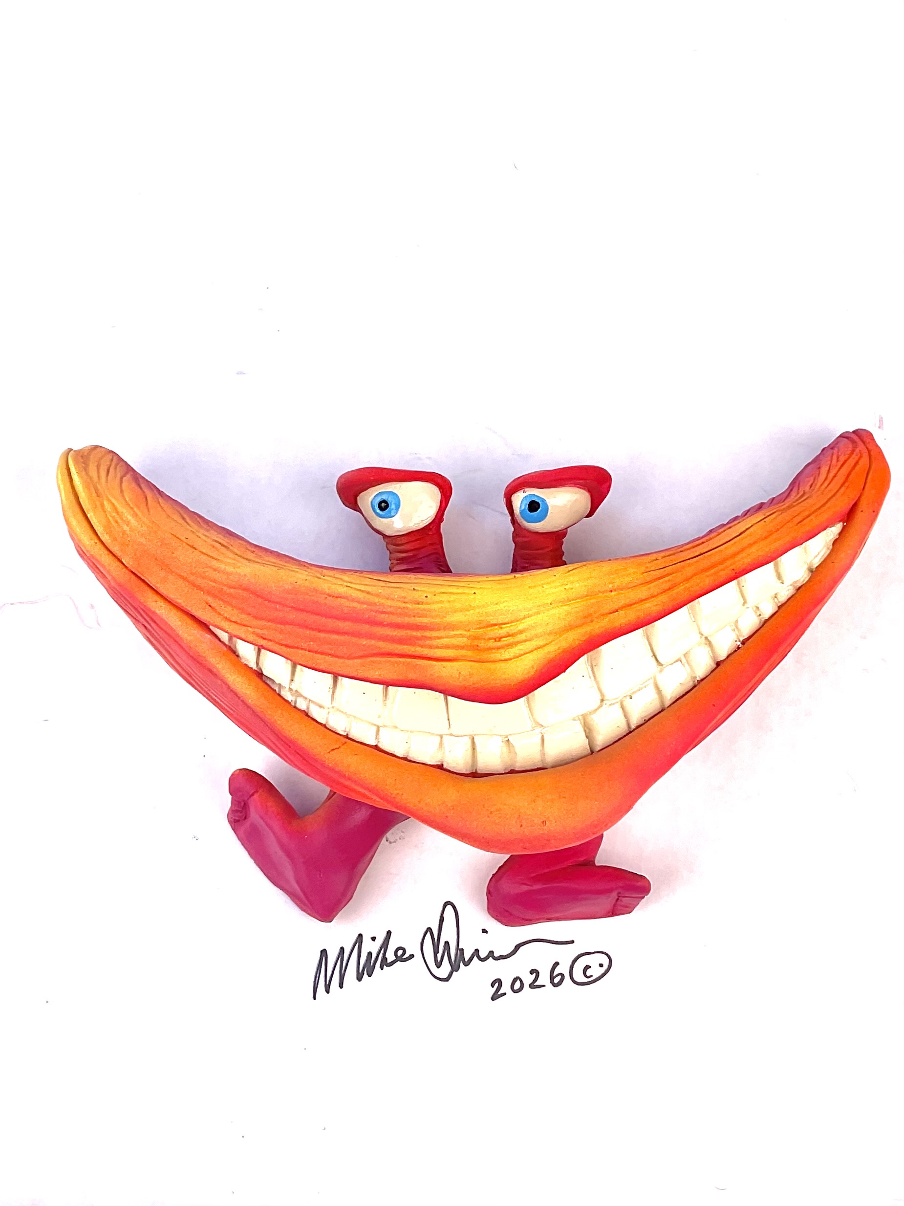 Mr. Happy won the genetic lotto on the reef, years of nuclear waste clean-up have been kind and he grew feet! Now he spends his evenings tap dancing for the locals at the Dance-o-rama. He measures 10.5″ x 5.5″ and hangs on the wall with a built-in hook. He’s sporting a hand-painted custom finish that is designed for indoor use or outside in a protected/covered area.