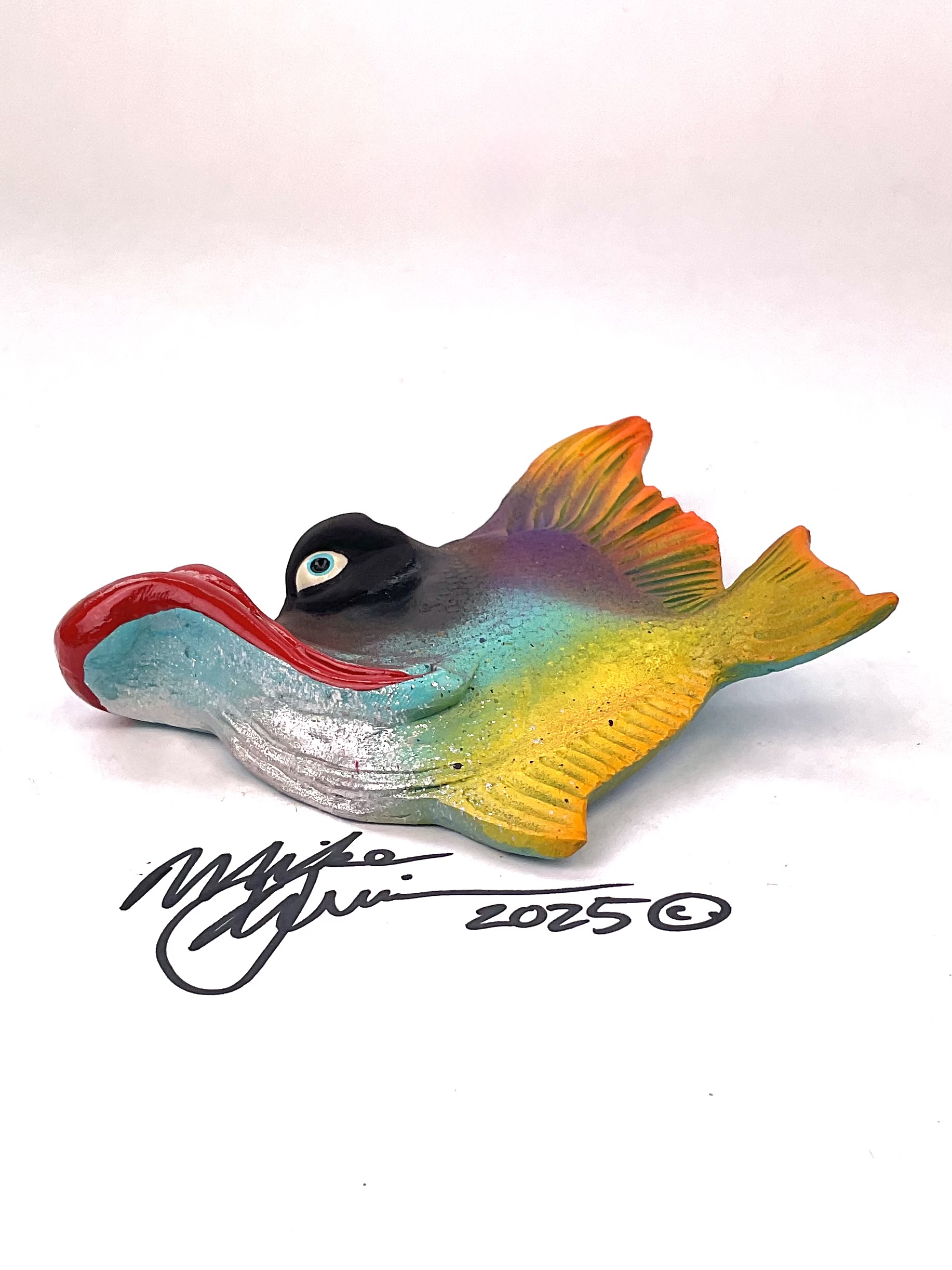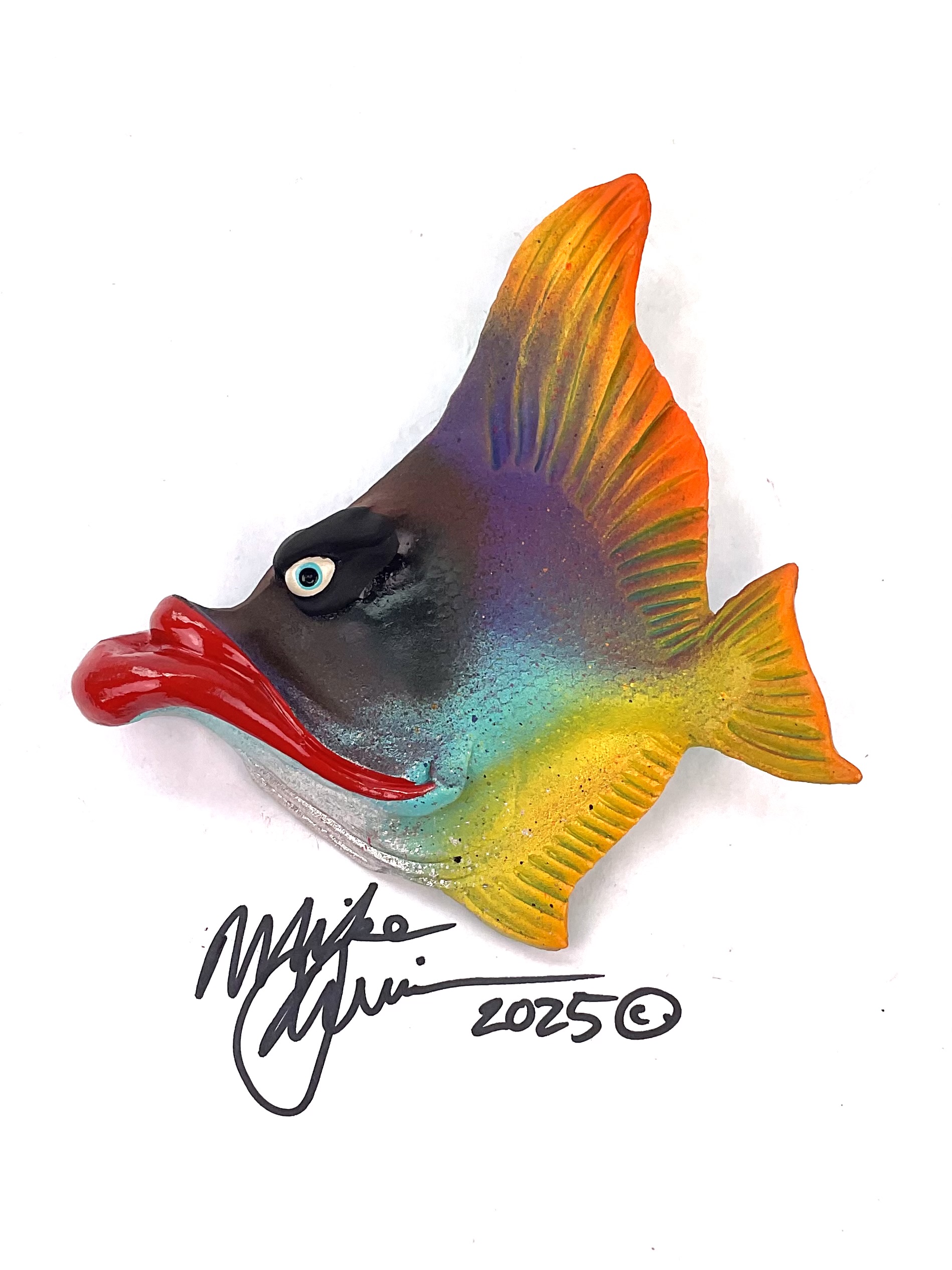 This piece is designed and created by artist Mike Quinn, it’s part of his Fish with Attitude collection. It’s one of a kind nature means it will have unique markings, design, spots, teeth, fur, claws or whatever is applicable to the creature posted.