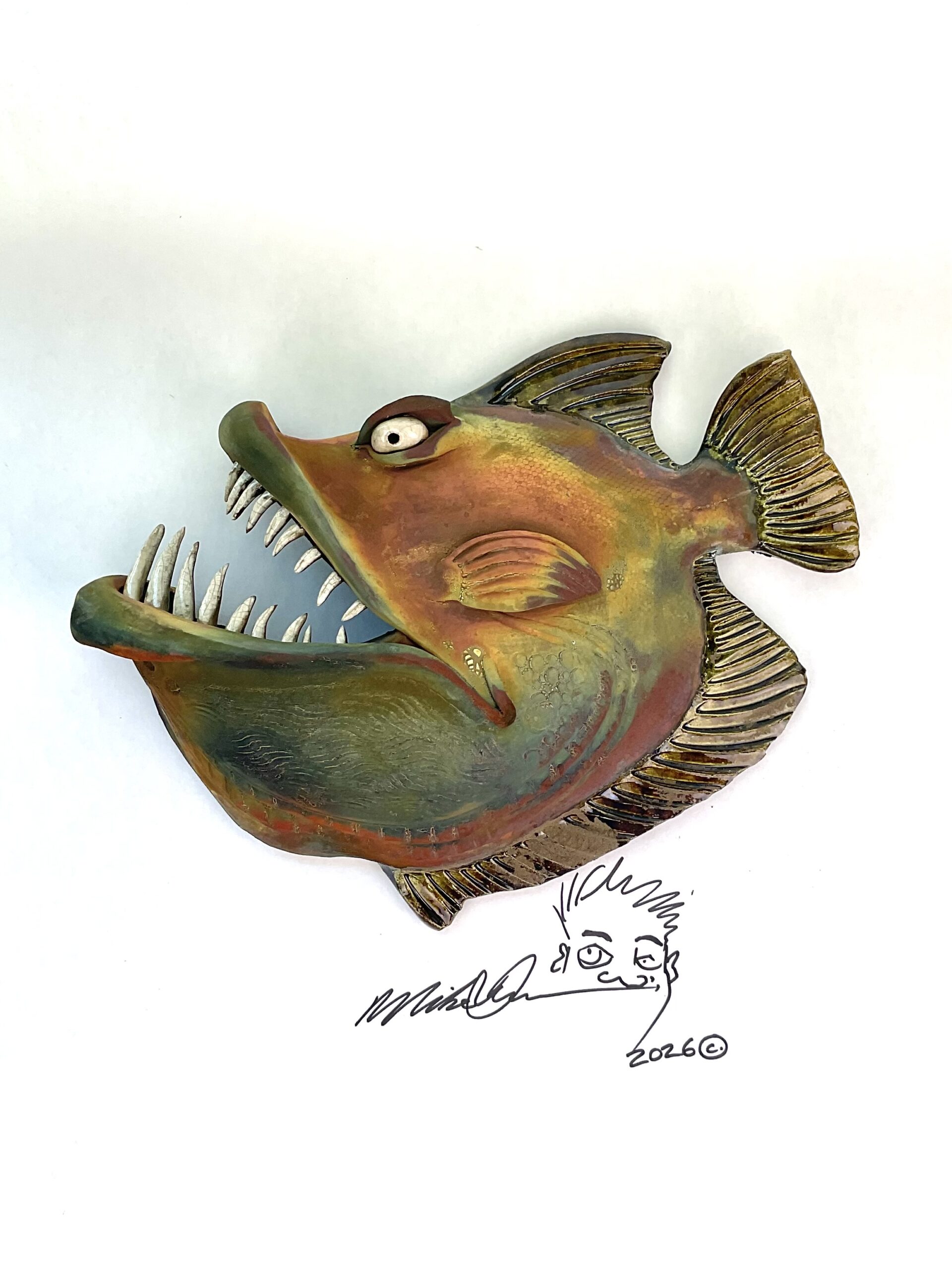 You are looking at a handmade one-off Toothfish with a raku finish and a wild personality. She measures 15″ x 12” x 4” and hangs on the wall with a built-in hanger. Shes sporting a custom finish designed for indoor use or outside without cover.