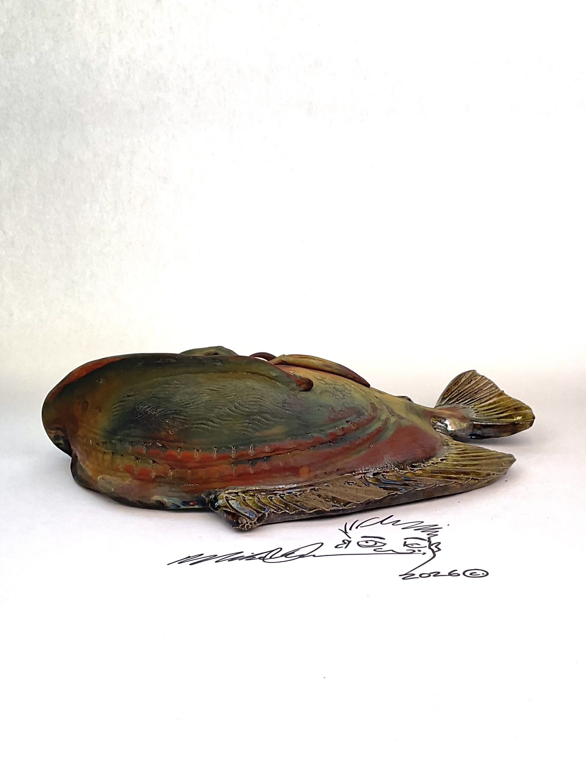 This piece is designed and created by artist Mike Quinn, it’s part of his Fish with Attitude collection. It’s one-of-a-kind nature means it will have unique markings, design, spots, teeth, fur, claws or whatever is applicable to the creature posted.