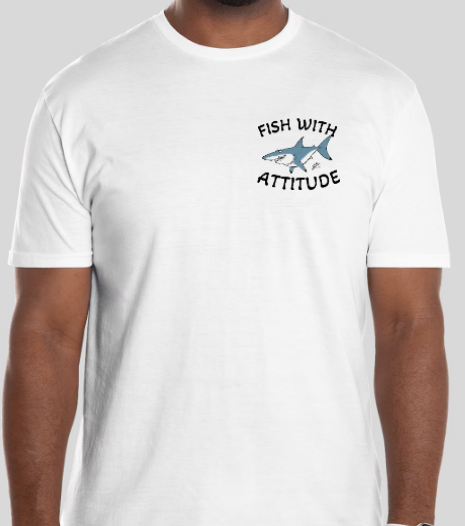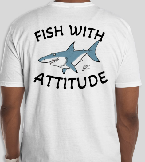 Who wouldn’t want a snazzy tee with Mike’s art on it? The solid White tee features a Shark on the Back. The front left chest rocks Mike’s signature and small Shark.